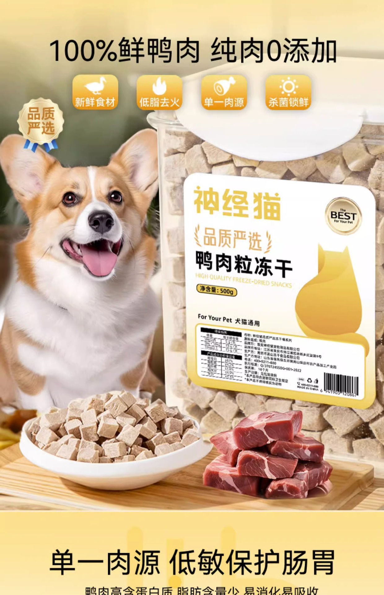 개 선택 품질 오리 동결 말린 배럴 중형 및 소형 개 어금니 치킨 과립 고양이 애완 동물 사료 테디 간식스토어 가기