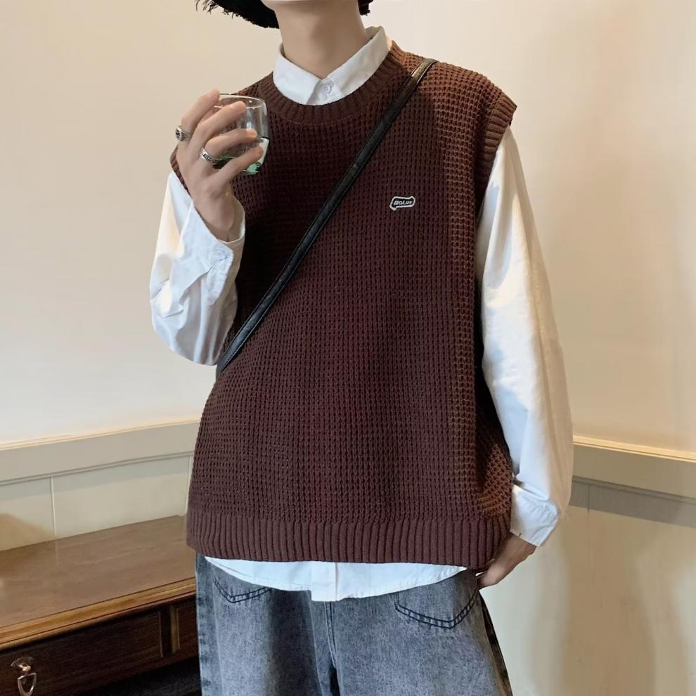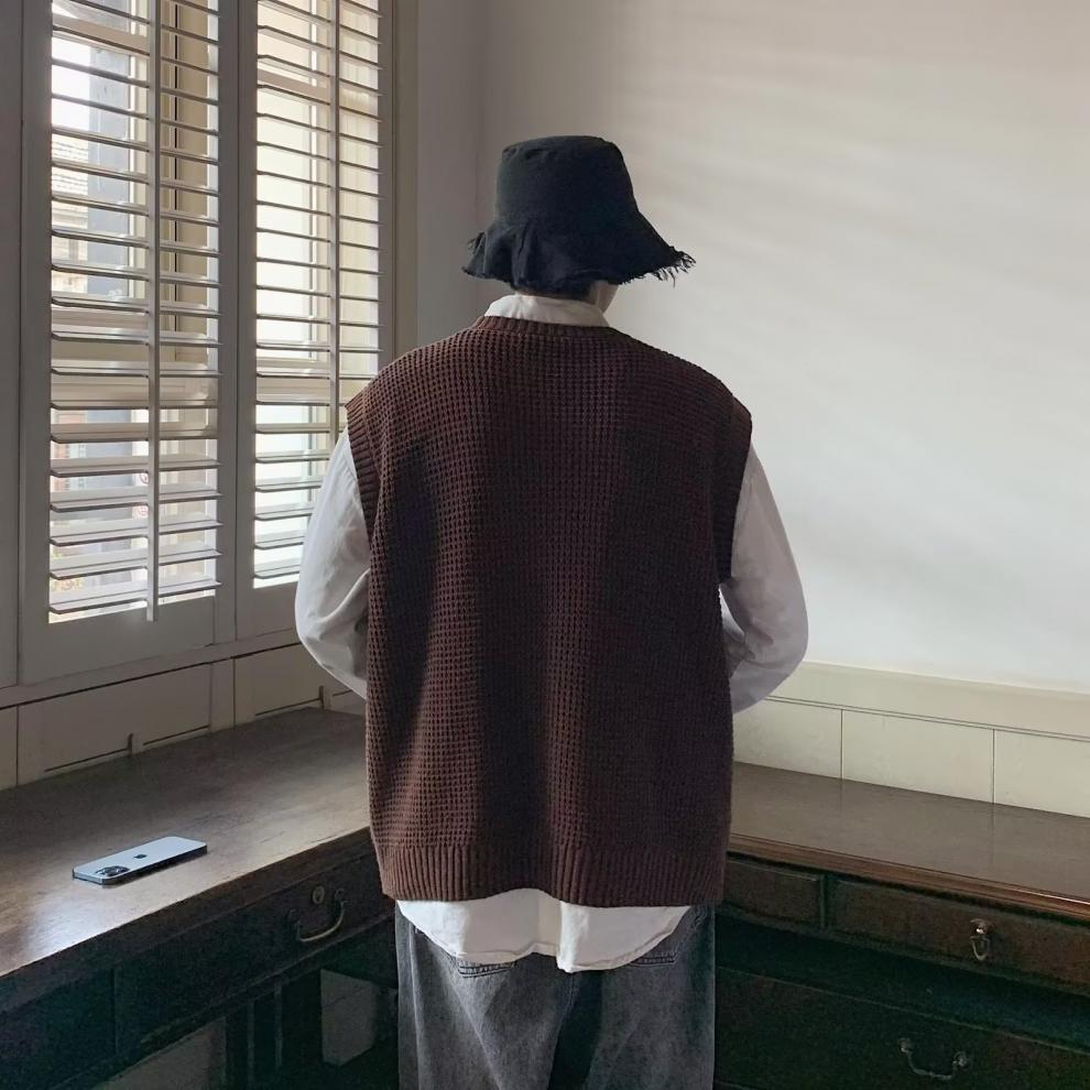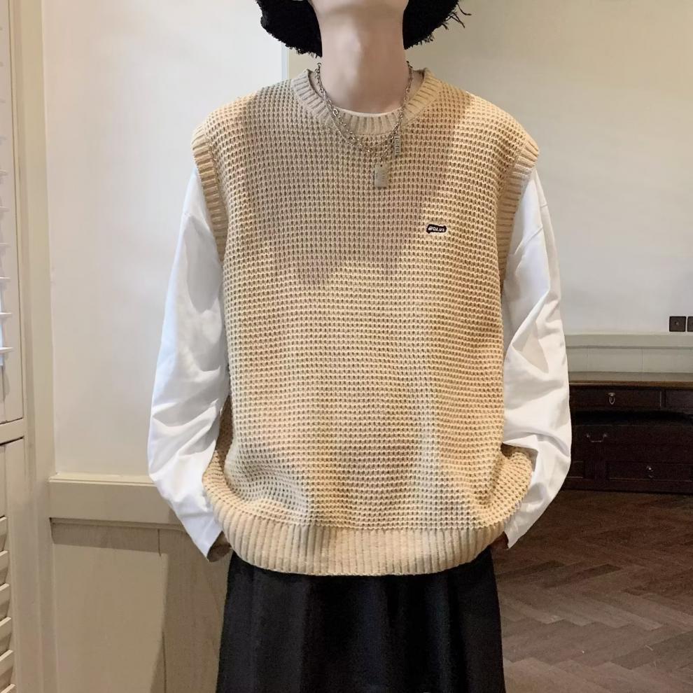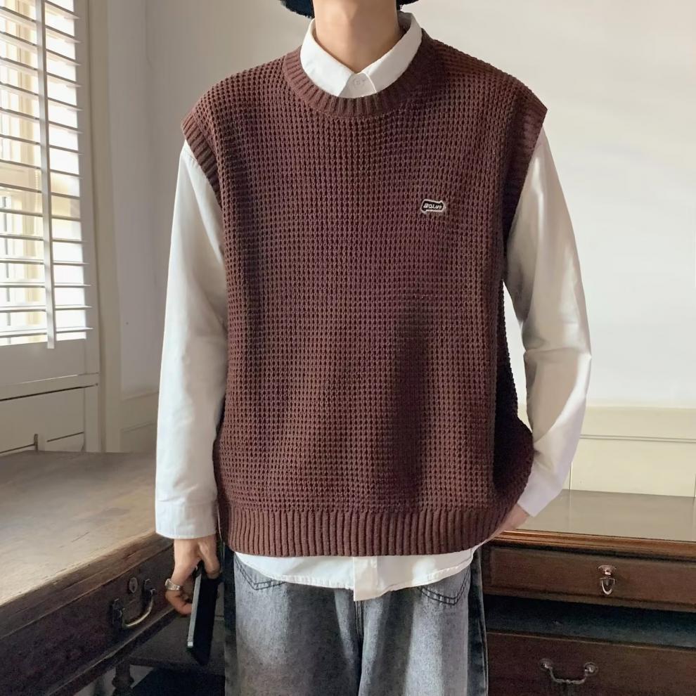 2023 봄과 가을 일본 복고풍 민소매 조끼 남자의 라운드 넥 단색 캐주얼 느슨한 울 조끼 유행스토어 가기