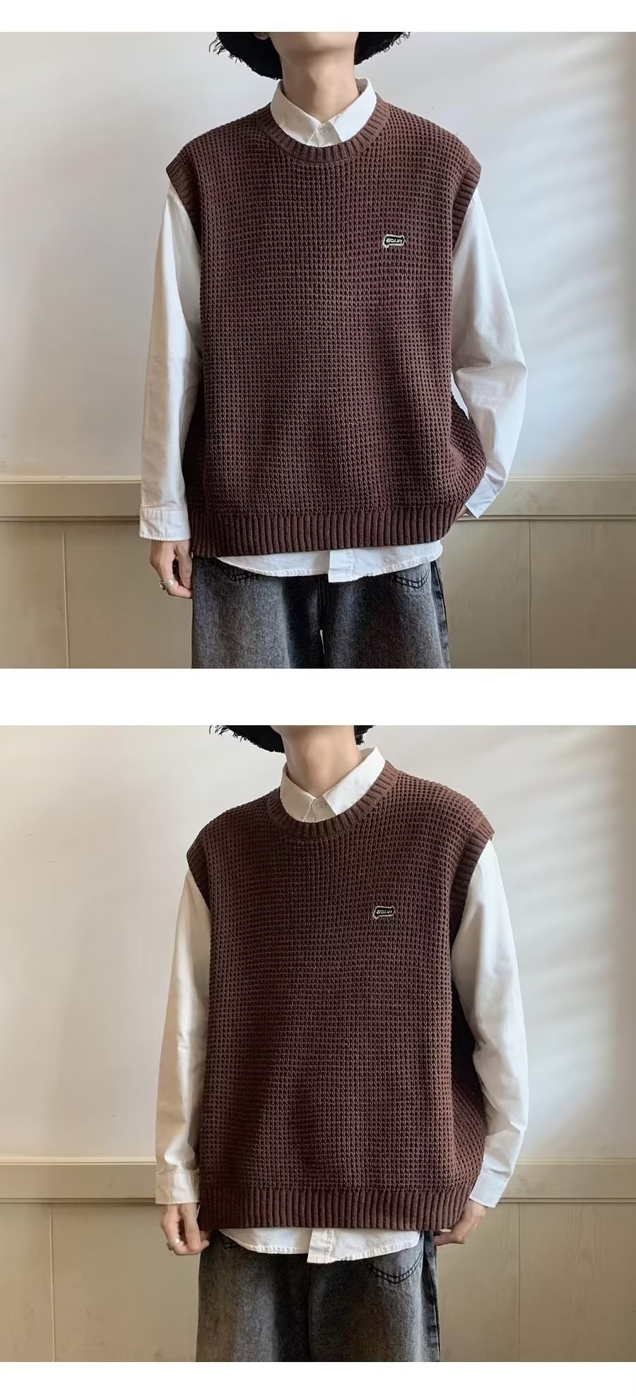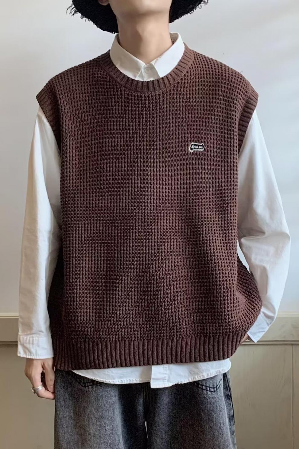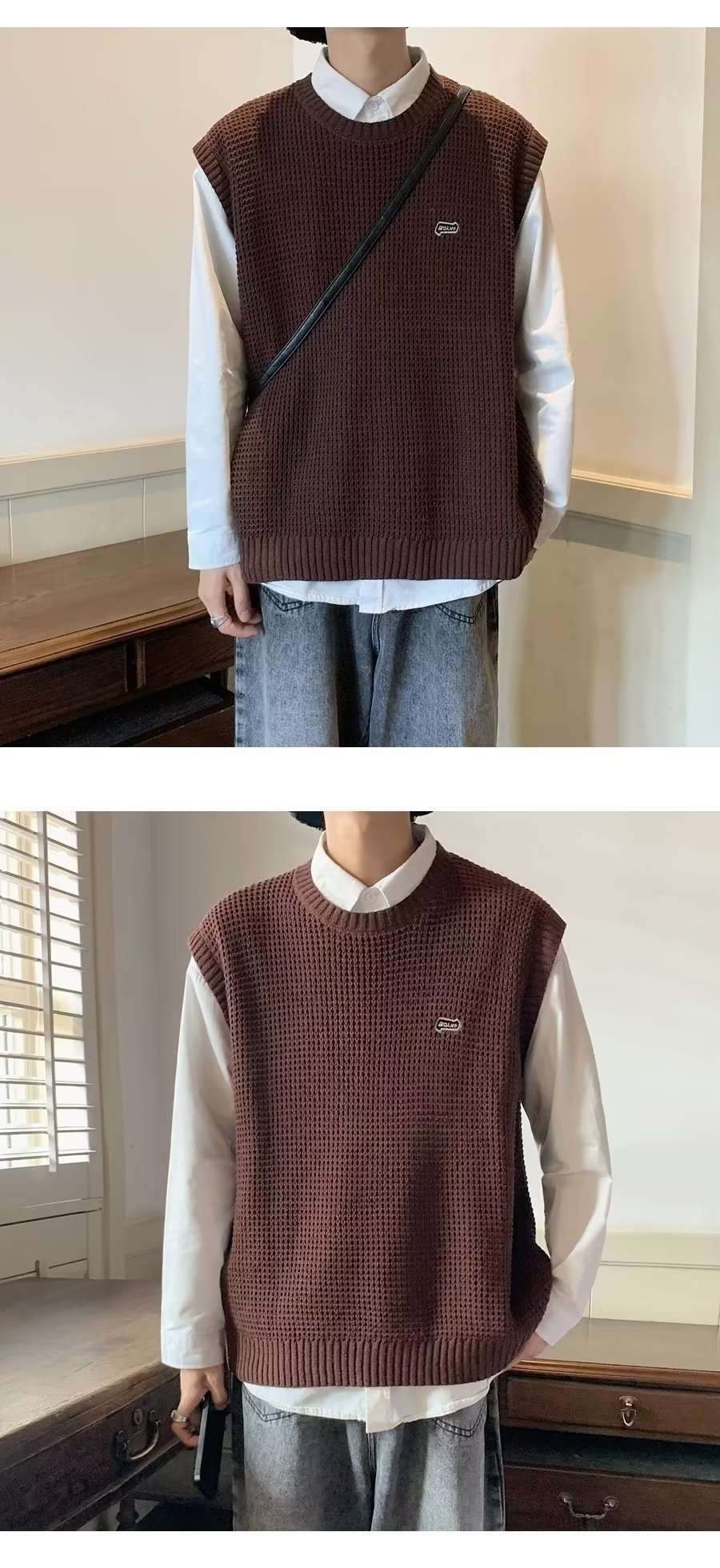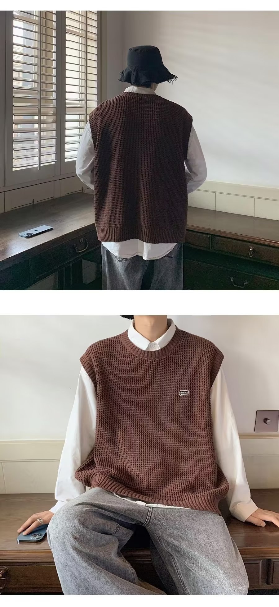 2023 봄과 가을 일본 복고풍 민소매 조끼 남자의 라운드 넥 단색 캐주얼 느슨한 울 조끼 유행스토어 가기