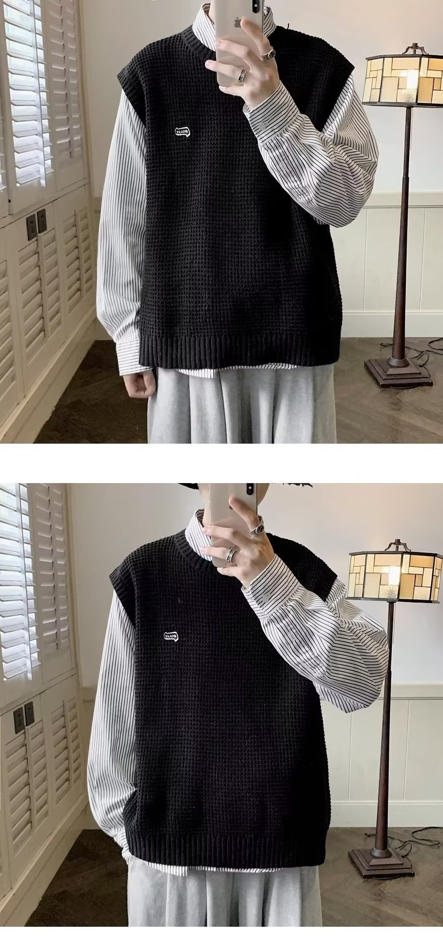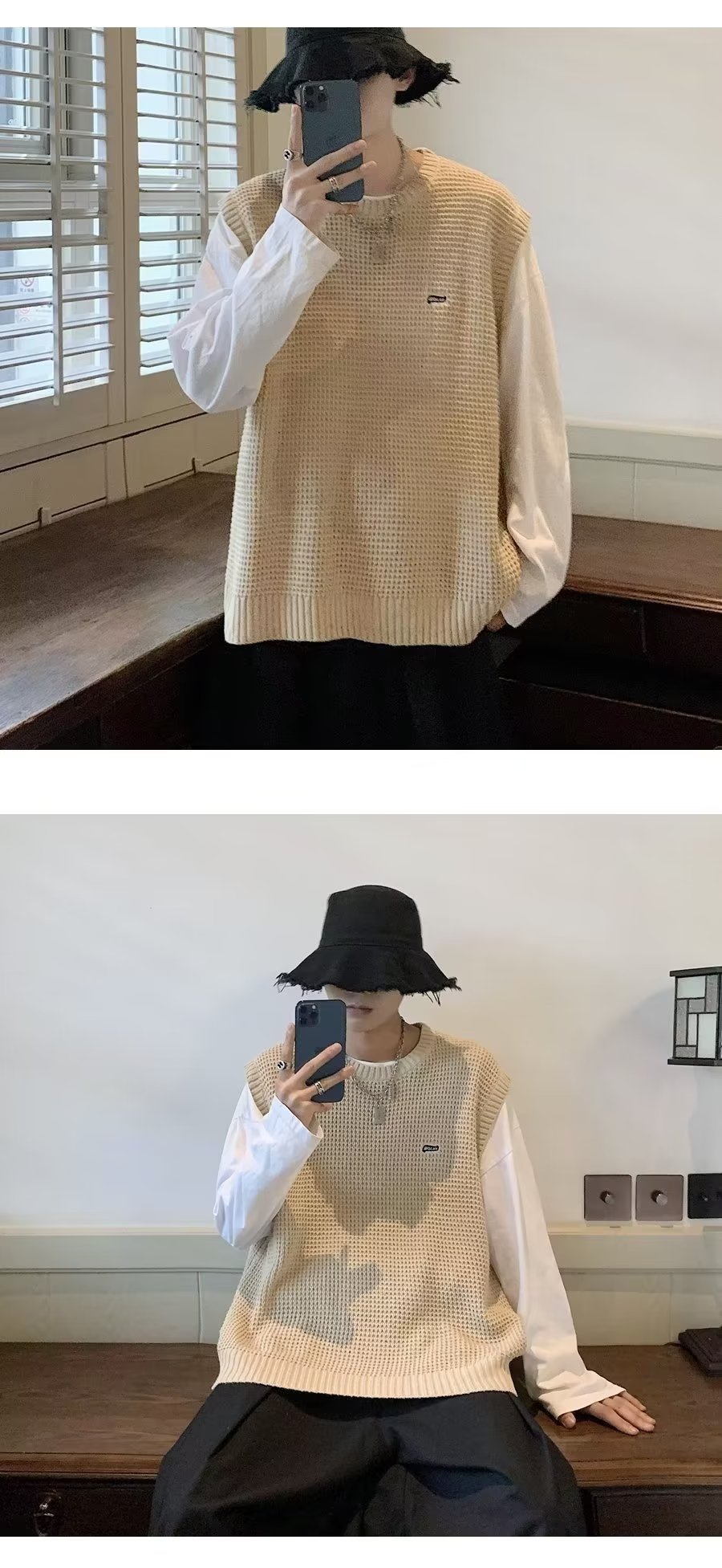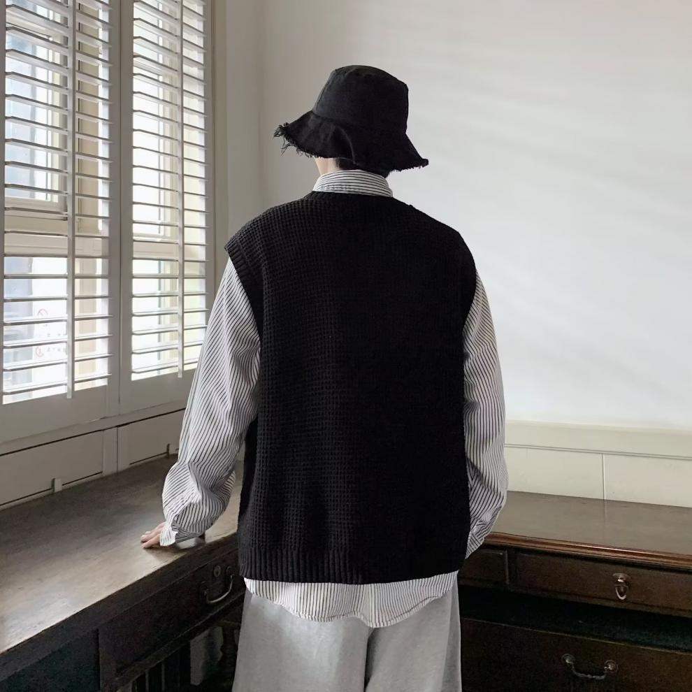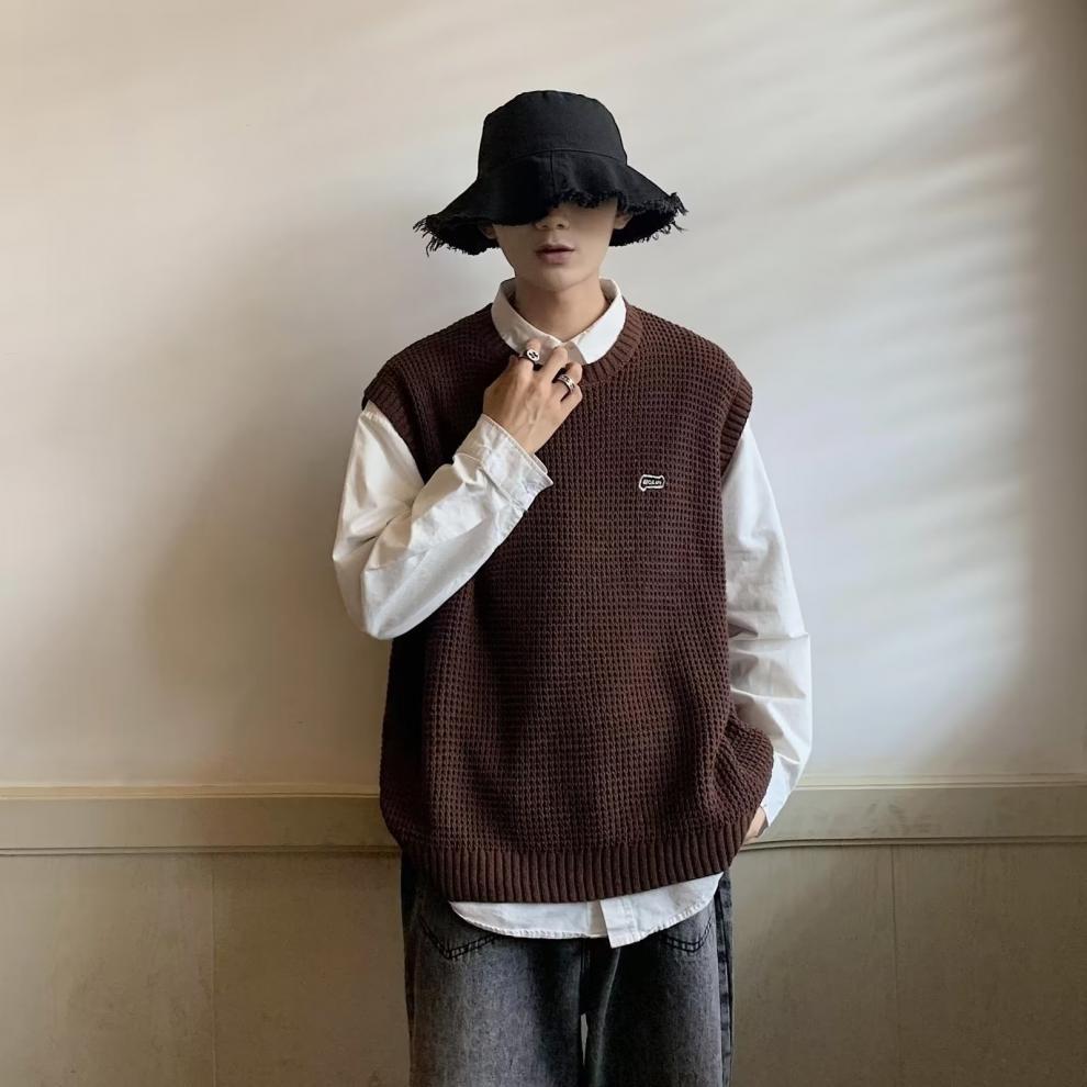 2023 봄과 가을 일본 복고풍 민소매 조끼 남자의 라운드 넥 단색 캐주얼 느슨한 울 조끼 유행스토어 가기