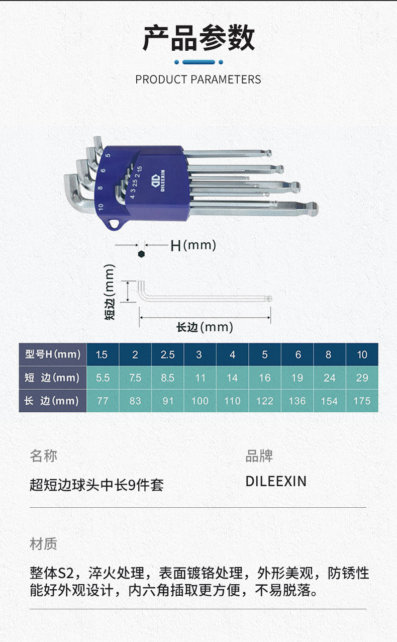 단면 육각렌치 9종 세트 단일 크롬 도금 S2 강화 L형 아연 도금 니켈 도금 육각렌치 연장 볼헤드스토어 가기