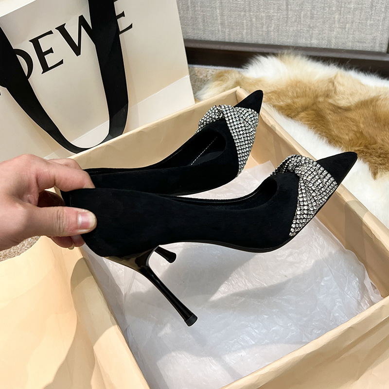 슬림 힐 하이힐, 뾰족한 라인스톤 싱글 슈즈, 펌프스 스웨이드 울트라 하이힐, 블랙 전문 다용도 하이힐 여성화 트렌드