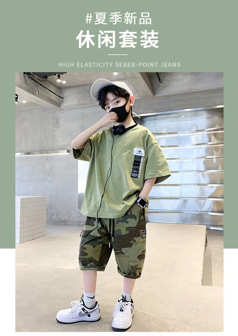 아동복 소년 여름 2023 신상품 위장 티셔츠 반 길이 바지 유행 캐주얼 루즈한 투피스 트렌디스토어 가기