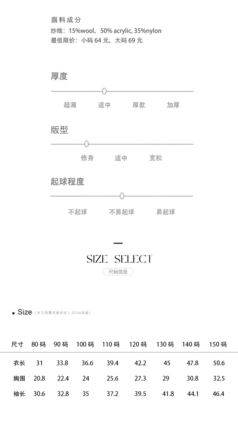 | 衣长 | 31 | 33.8 | 36.6 | 39.4 | 42.2 | 45 | 47.8 | 50.6 |