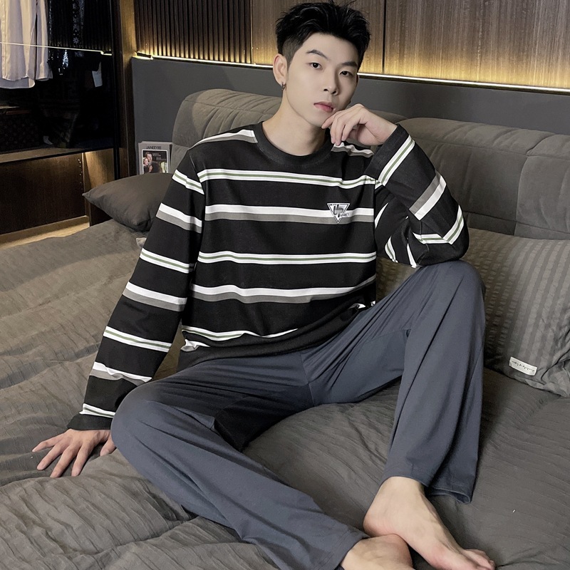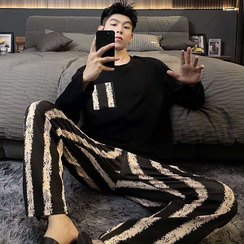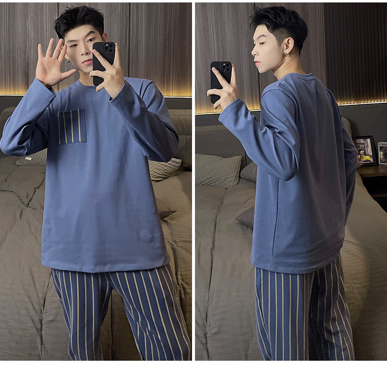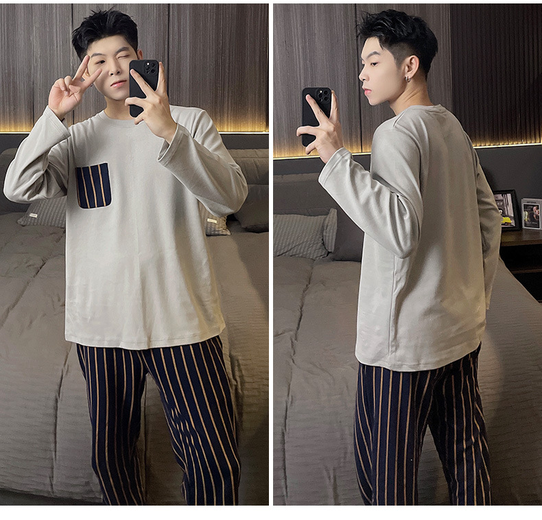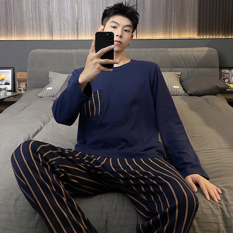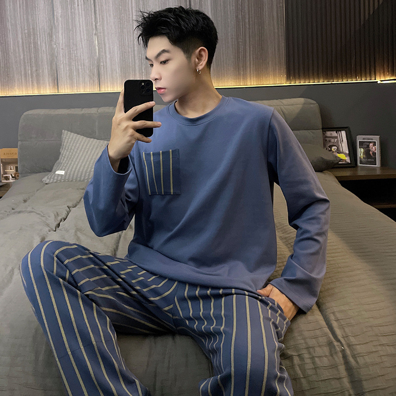 더블 포켓 잠옷 남자의 긴 소매 가을과 겨울 모조 면 스트라이프 한국 스타일 복장 잘 생긴 플러스 사이즈 가정 옷 세트스토어 가기