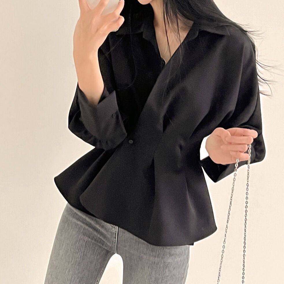 2023 봄과 가을 새로운 복고풍 꽉 허리 스커트 세련된 러플 디자인 틈새 긴 소매 시크 셔츠 탑
