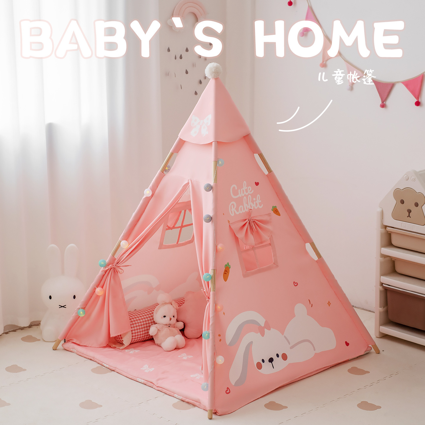 • 텐트 + 두꺼운 바닥 매트 + 모자 + 스트링 조명 + 고정 장치