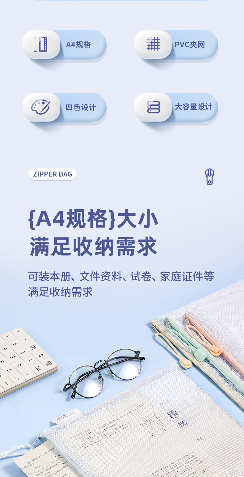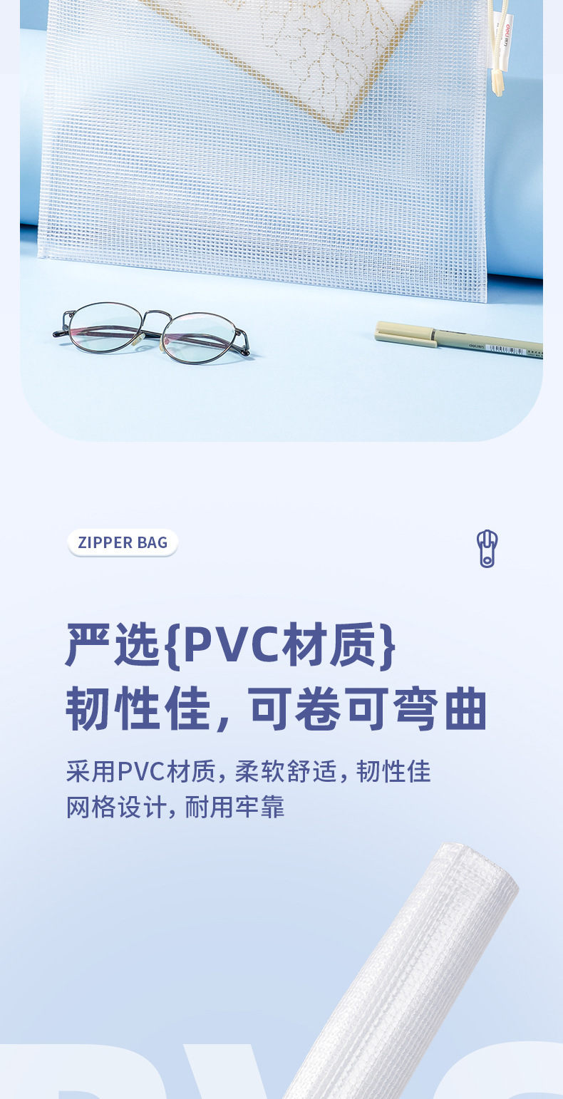 델리 63479A-A4 투명 그리드 지퍼 가방 학생 시험지 과목 분류 파일 보관 가방 파일 가방