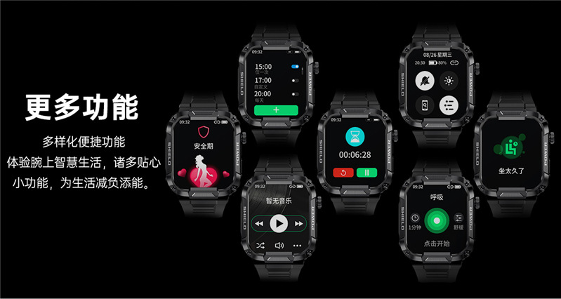 产品 | 功能介绍 | 计步、运动距离、卡路里消耗、心率检测、血压检测、血氧检测、天气预报、语音助手、蓝牙通话、蓝牙音乐、多运动模式、SNS消息提醒、睡眠检测、秒表、计时器、闹钟、呼吸训练、查找手机、久坐提醒、智能闹钟、女性生理提醒、小游戏等 |