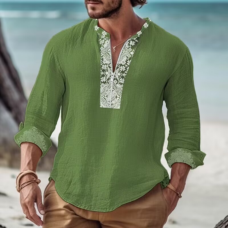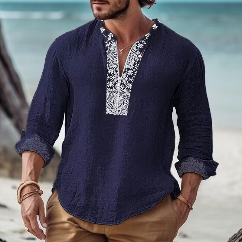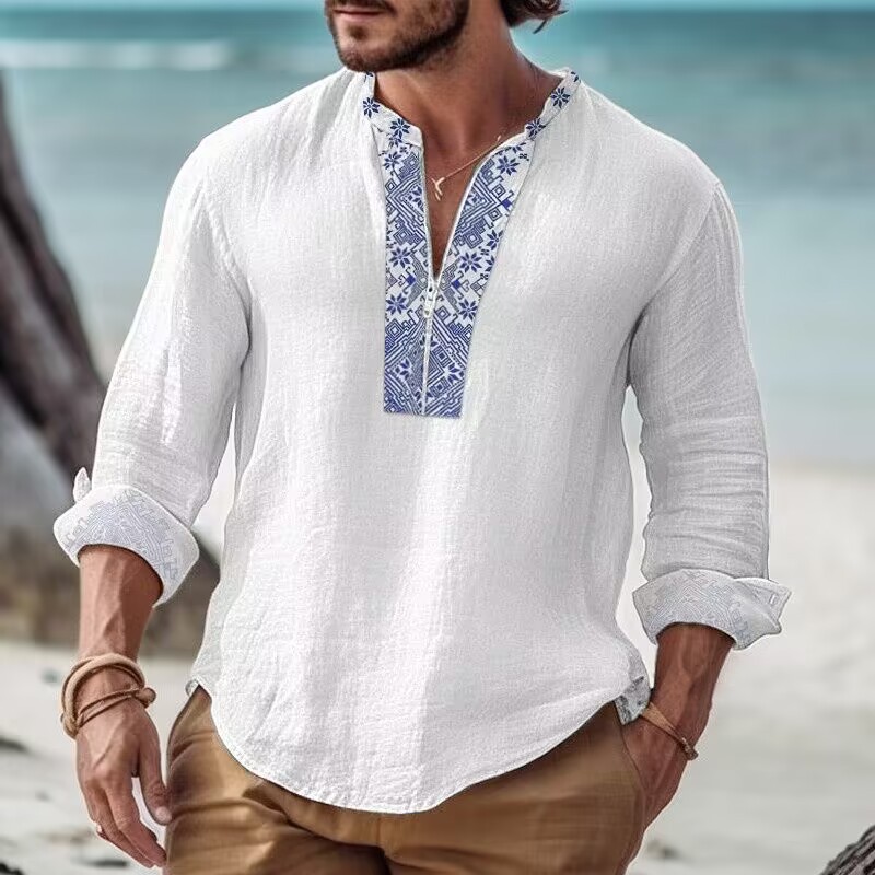 2023 크로스 보더 아마존 핫 남성 패션 인쇄 캐주얼 긴 소매 스탠드 칼라 셔츠