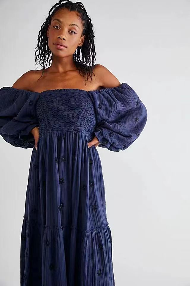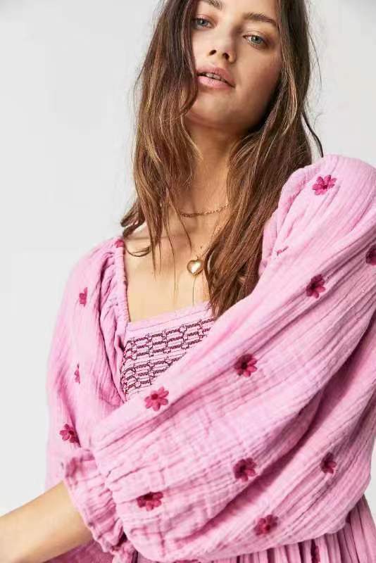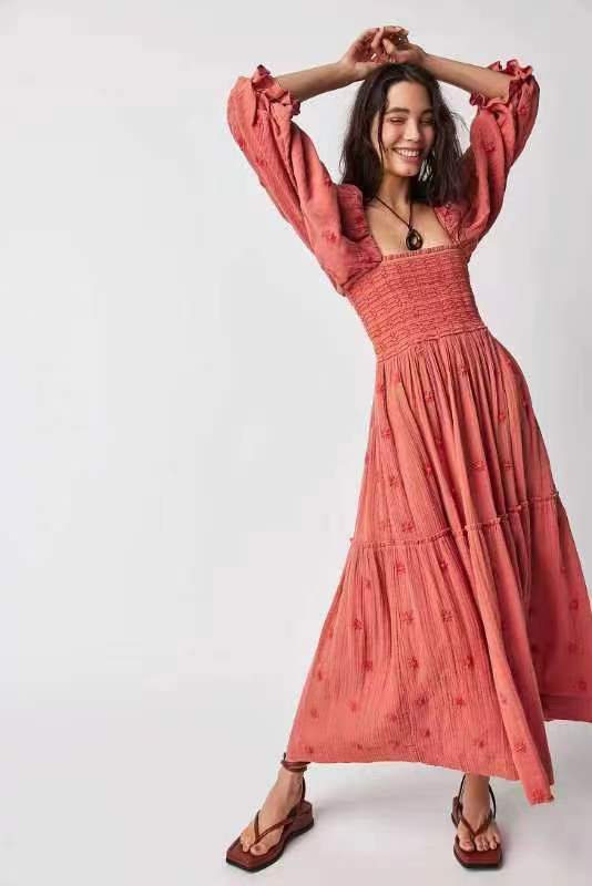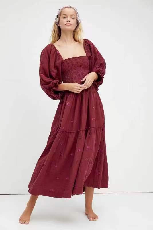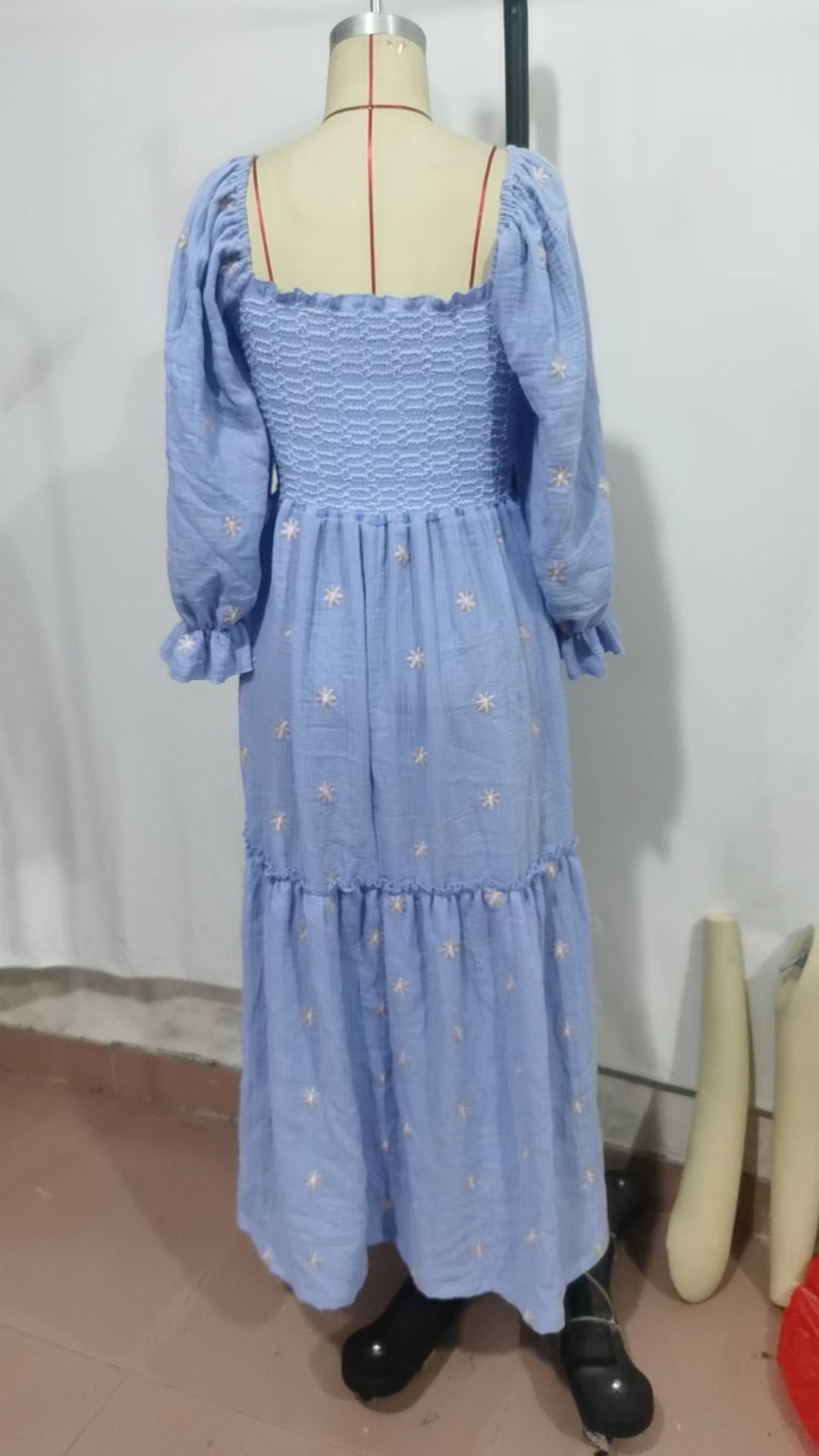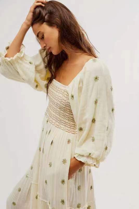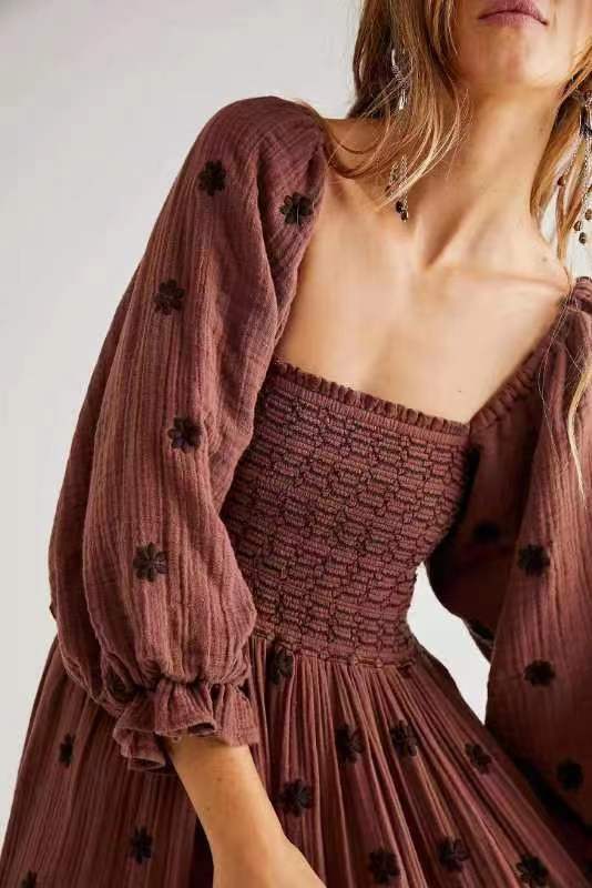 가을 2023 새로운 캐주얼 트럼펫 소매 자수 광장 목 해바라기 원피스