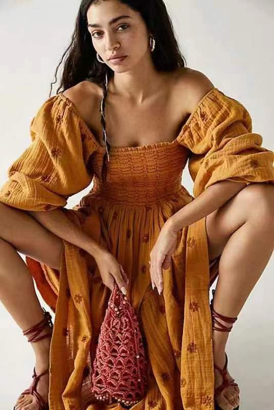 가을 2023 새로운 캐주얼 트럼펫 소매 자수 광장 목 해바라기 원피스스토어 가기