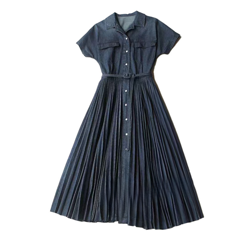 재고 Churan 같은 스타일 블루 데님 원피스 레트로 하이 웨이스트 슬리밍 꽉 허리 주름 셔츠 원피스 여성을위한스토어 가기
