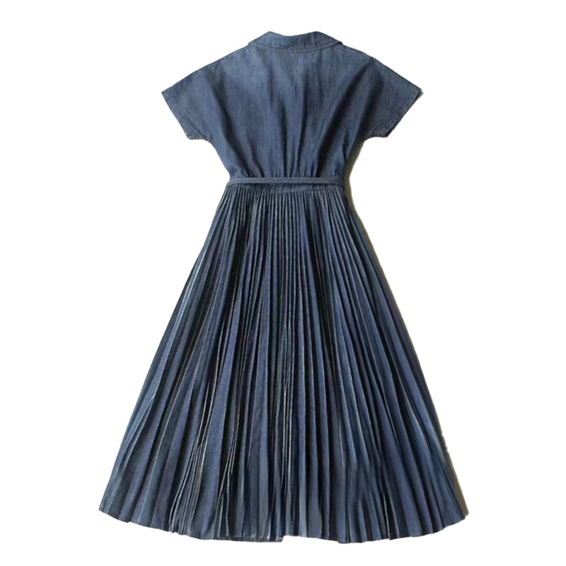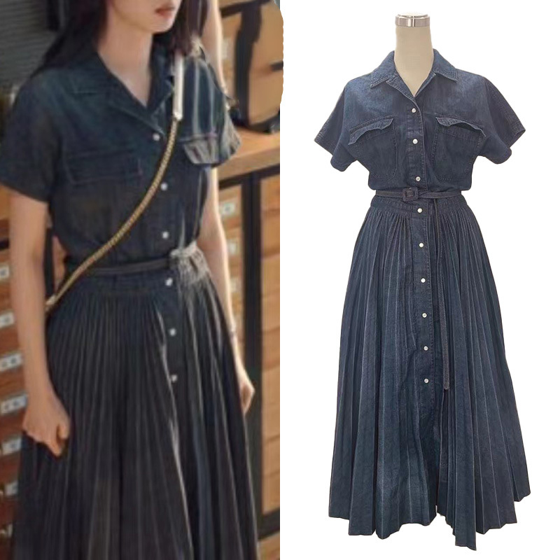 재고 Churan 같은 스타일 블루 데님 원피스 레트로 하이 웨이스트 슬리밍 꽉 허리 주름 셔츠 원피스 여성을위한