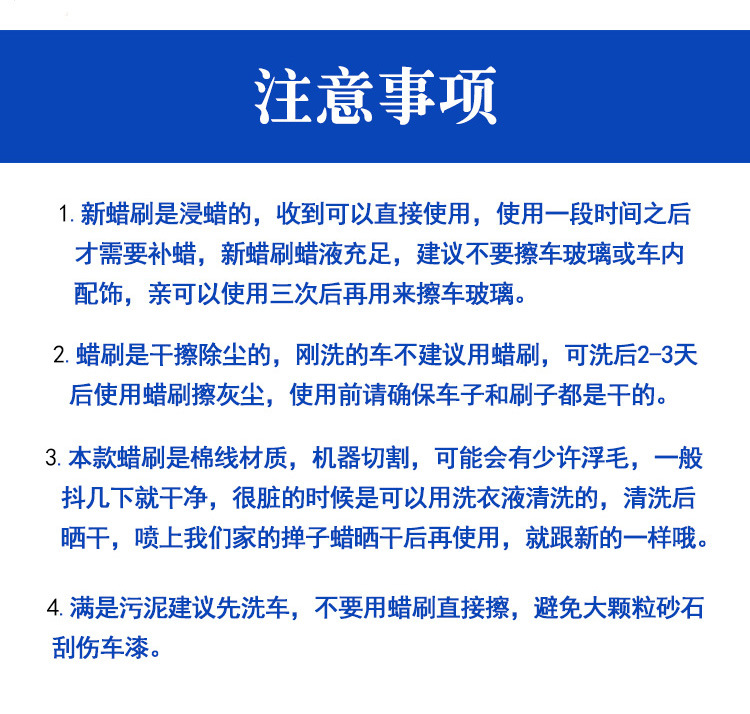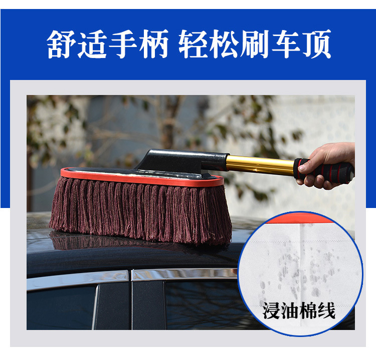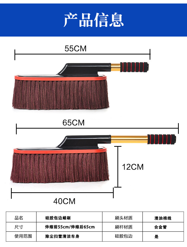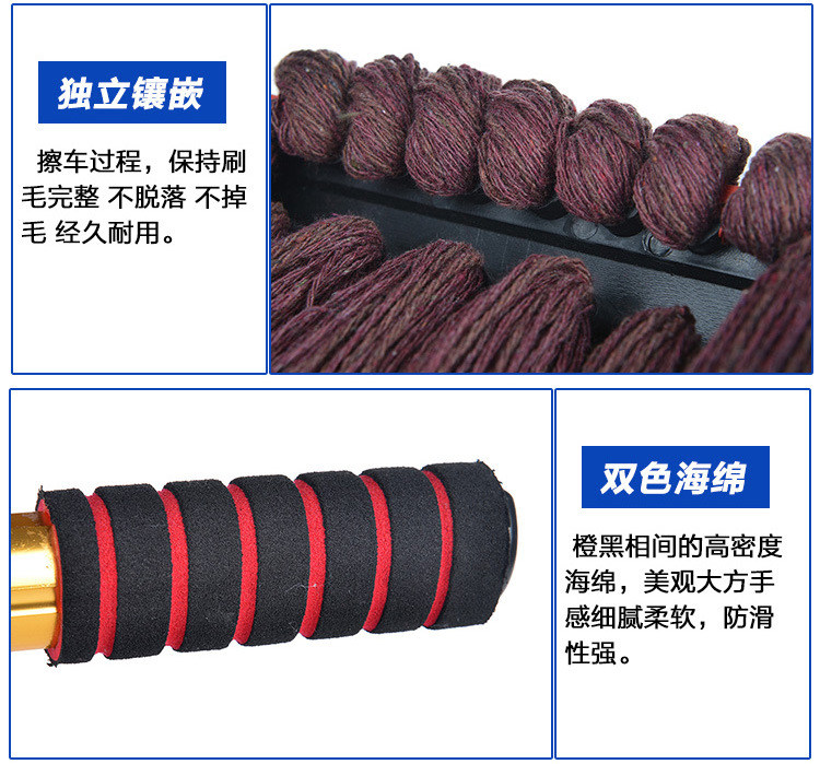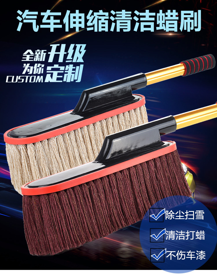 1、加厚合金伸缩把手,伸缩自如,结实耐用,想擦哪儿就擦哪儿;2纯棉毛线,硅胶包边,不起静电,不伤车漆。3、独立式镶嵌固定工艺, 毛线不脱落,易打理.4、采用高新技术特制蜡油渗进,保护车漆,持久亮泽