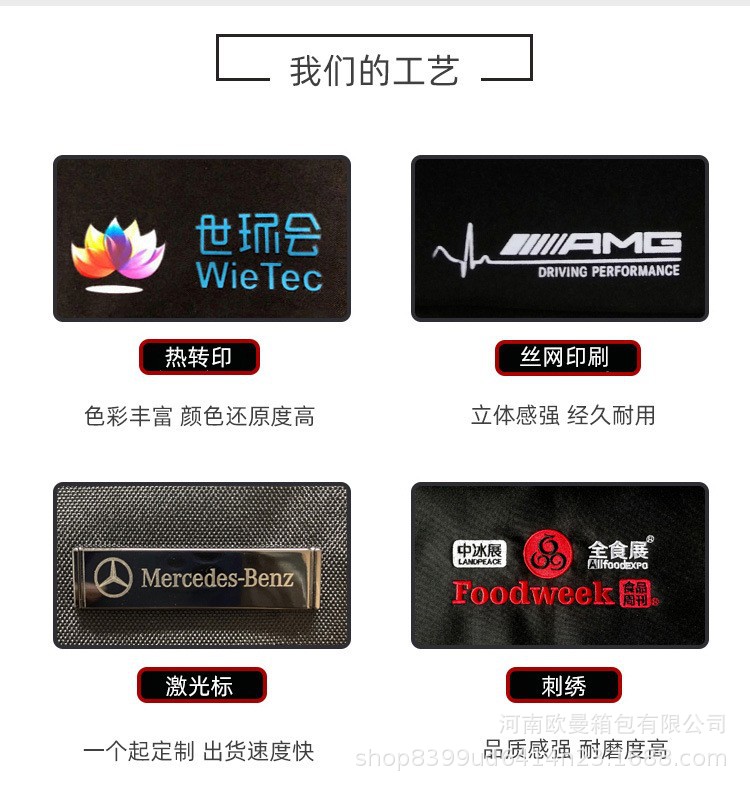 2.Logo制作工艺:提供丝印、绣花、压花、烫金、胶标标牌等。