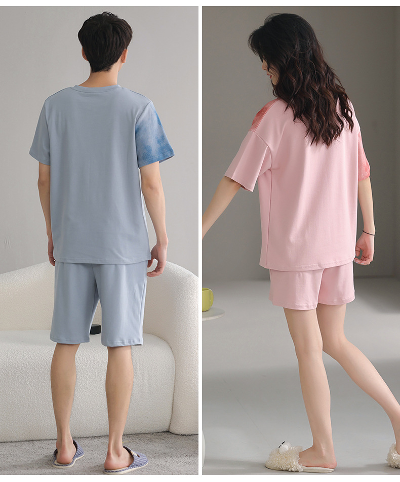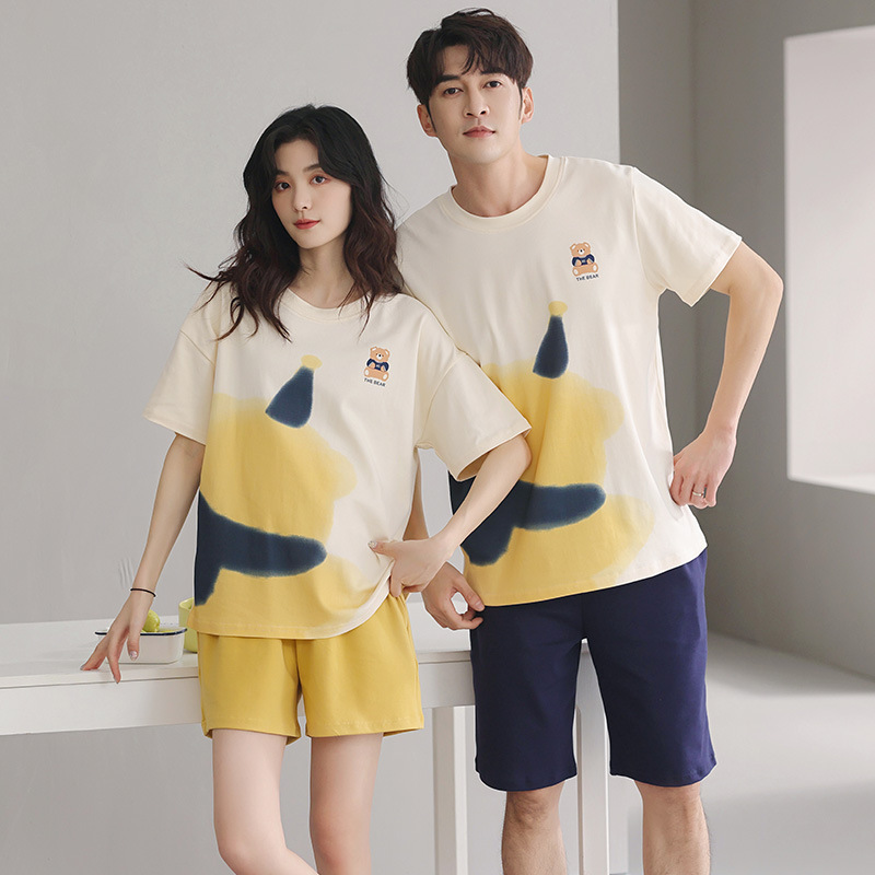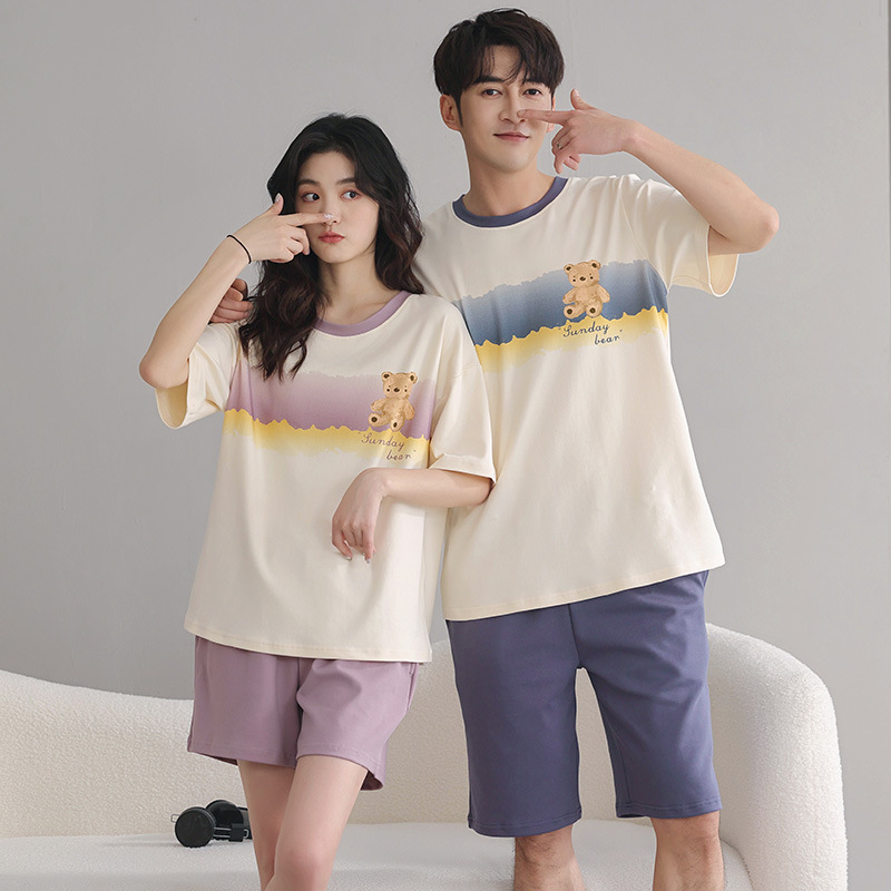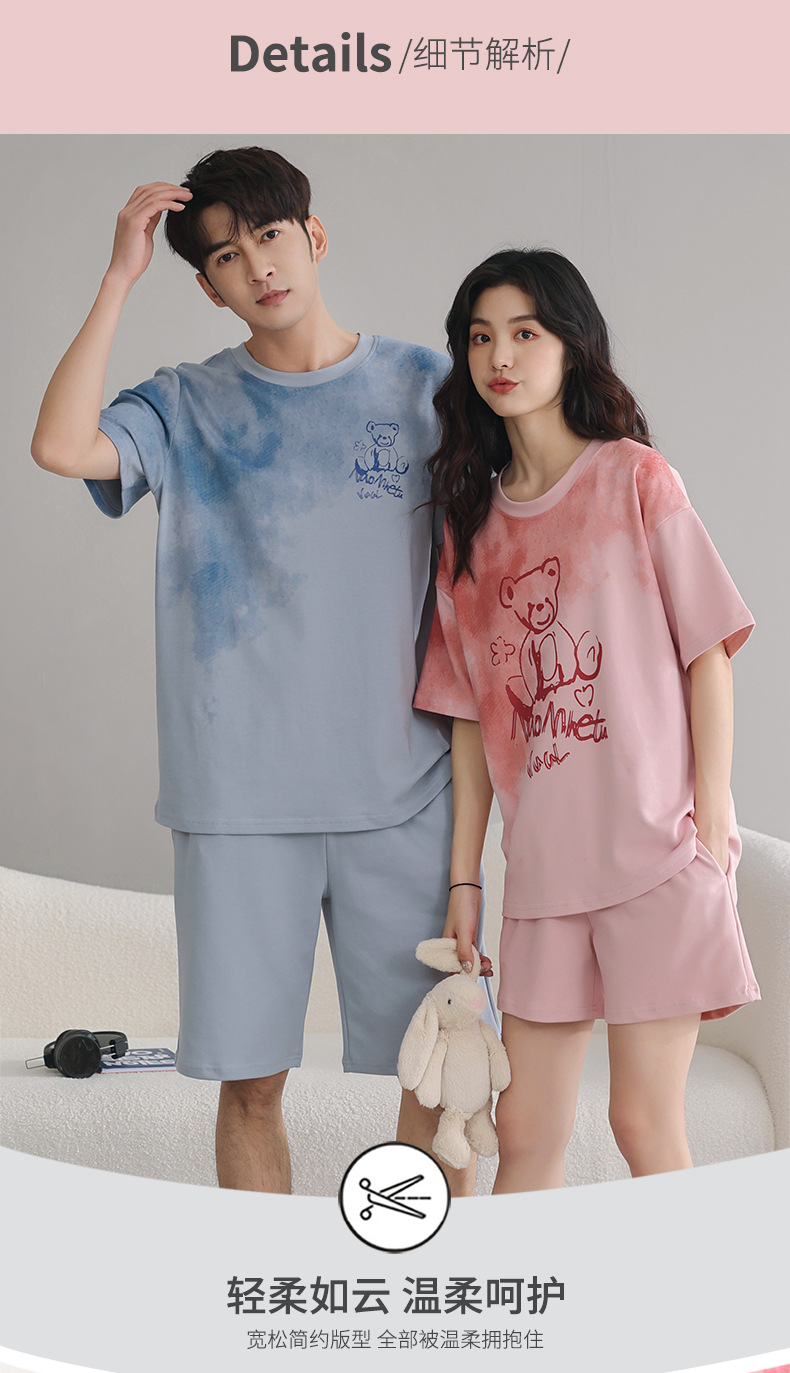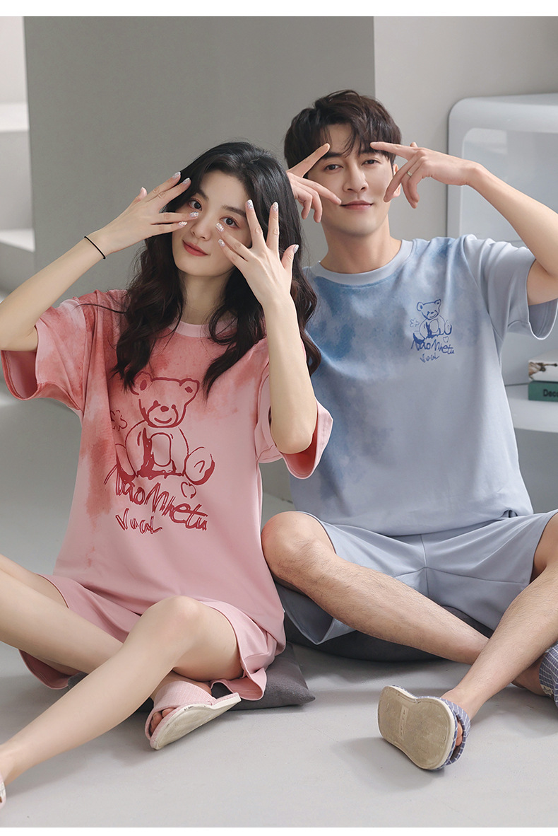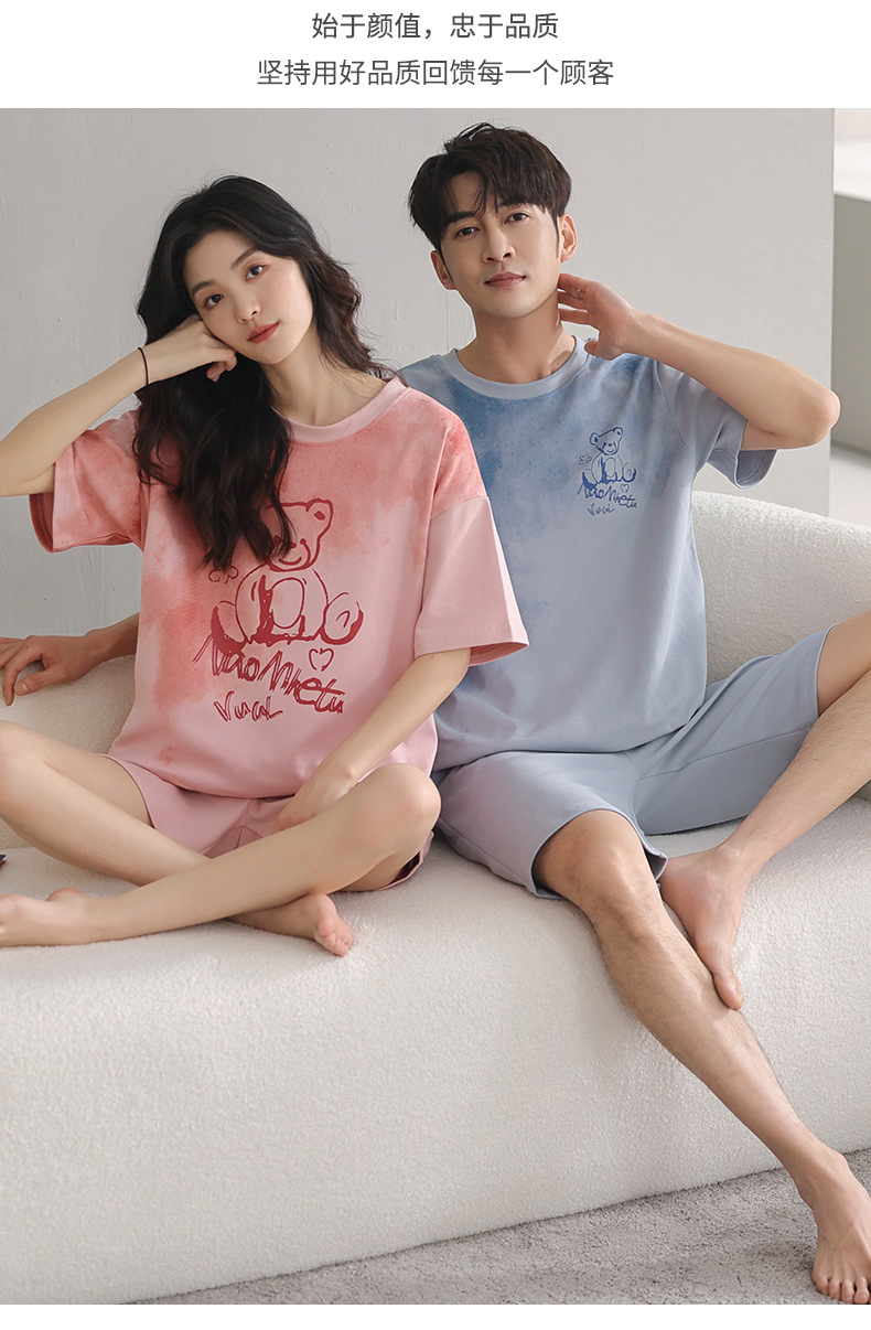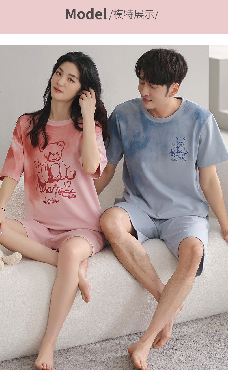 32수 순면 반팔 라운드넥 만화 커플 잠옷, 여름용 남녀 홈웨어, 외출복으로도 착용 가능한 캐주얼 시원한 세트