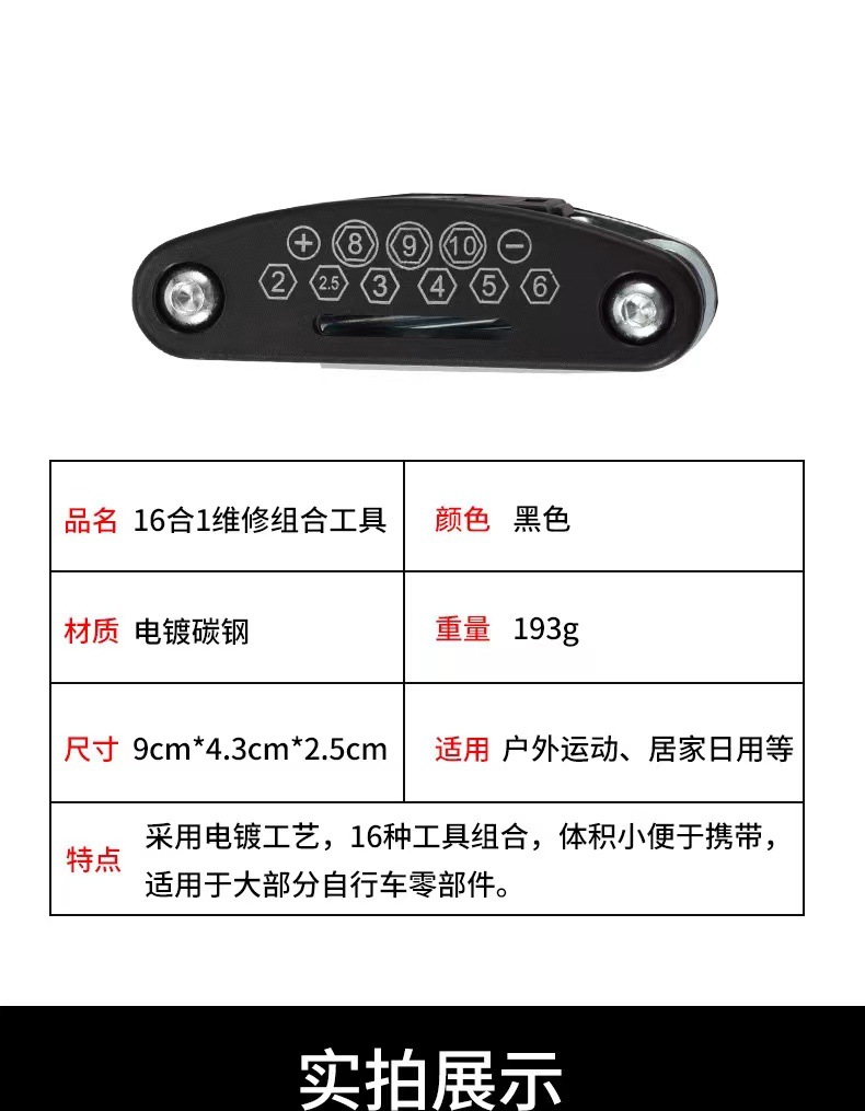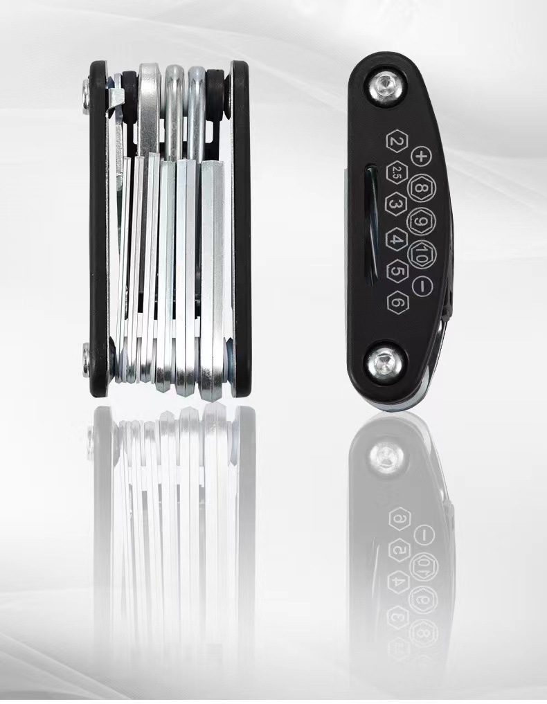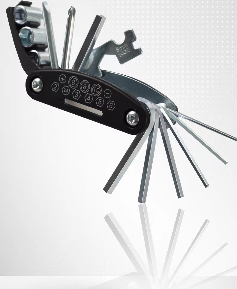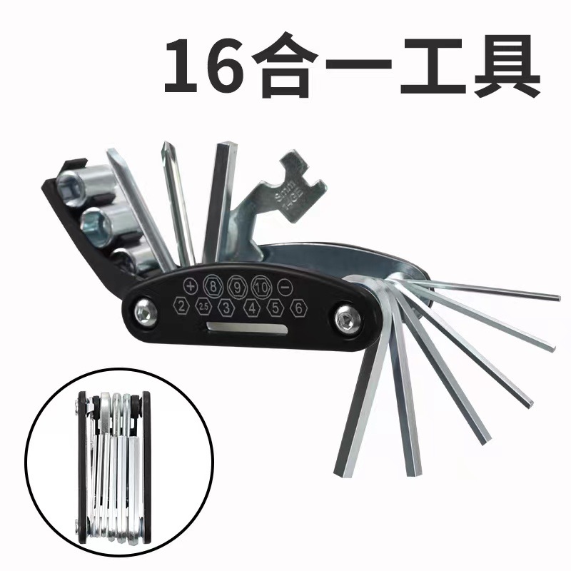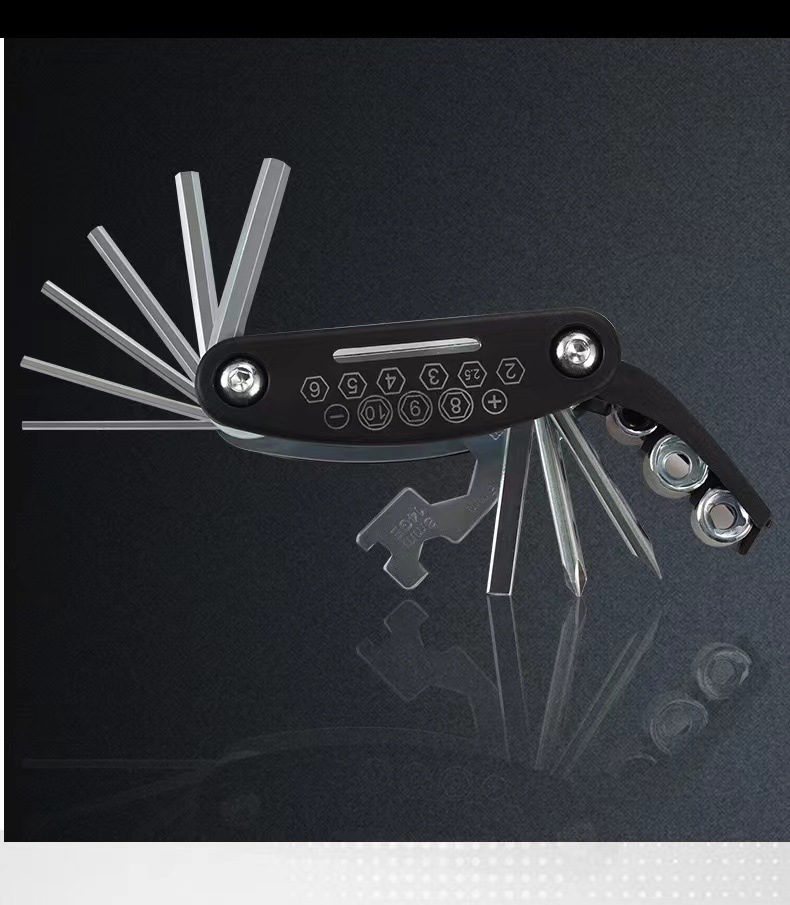 1.多用自行车维修工具:2mm/2.5mm/3mm/4mm/5mm/6mm内六角扳手各一支;8mm/9mm/10mm/套筒扳手各一只;一字/十字螺丝刀各一支;8mm/9mm/10mm外六角扳手各一个;14g轮圈辅条扳手一个。