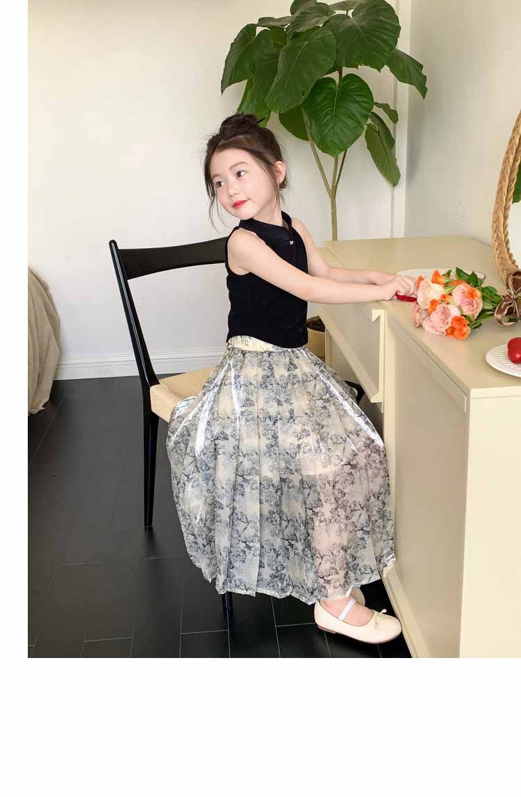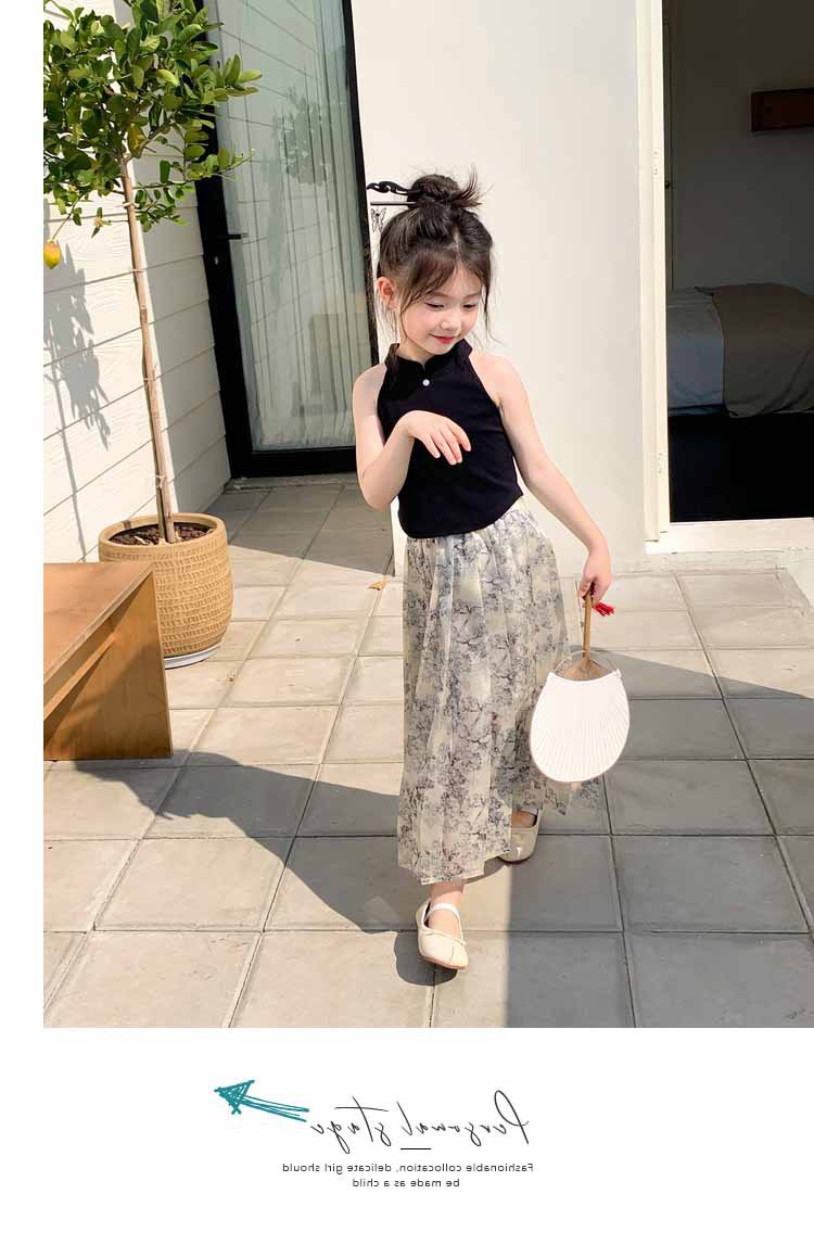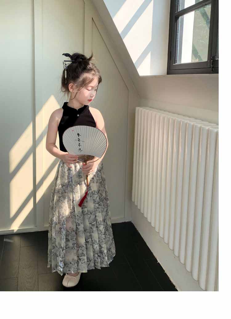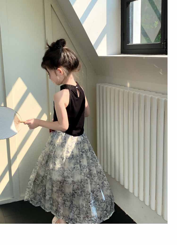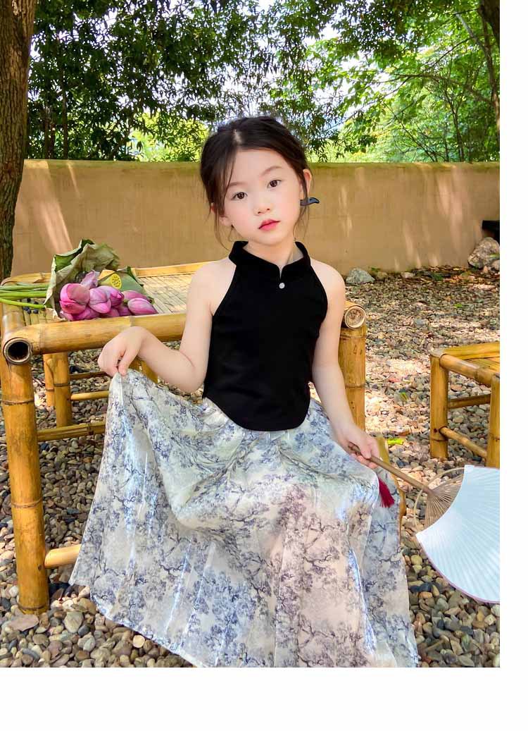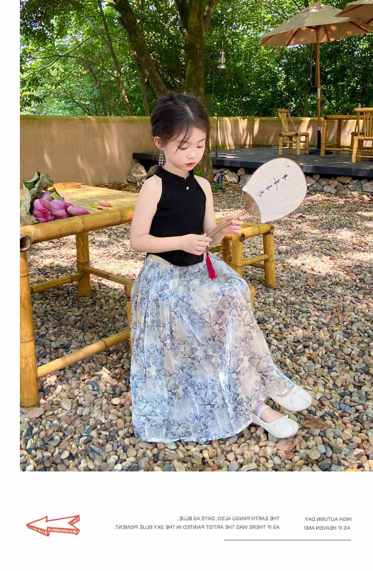 여자 새로운 중국어 세트 새로운 여름 외국 스타일 조끼 + 잉크 꽃 치마 2 피스 세트 어린이를위한 머리 세대스토어 가기