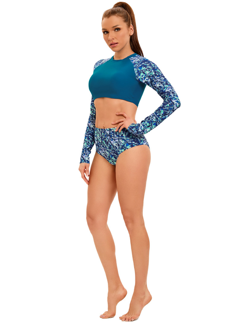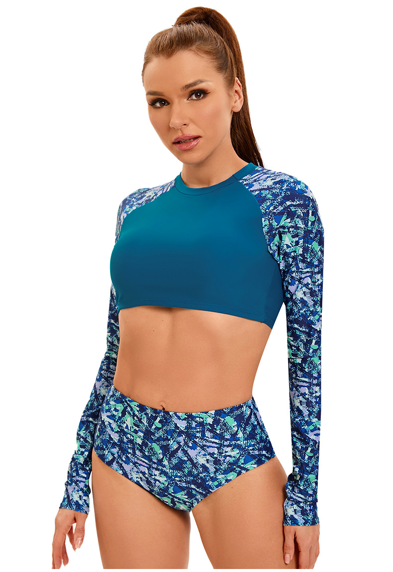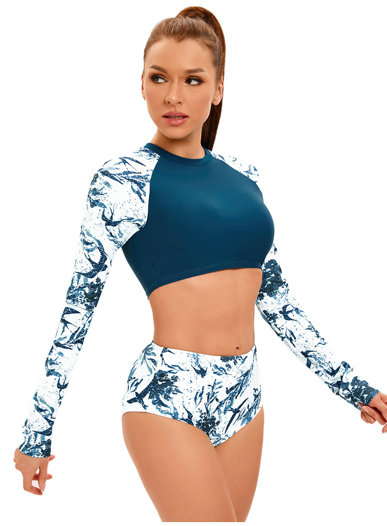 크로스 보더 새로운 프린트 긴팔 스플릿 수영복 여성용 아마존 하이 웨이스트 서퍼 의류 유럽과 미국 섹시 보수적 수영복