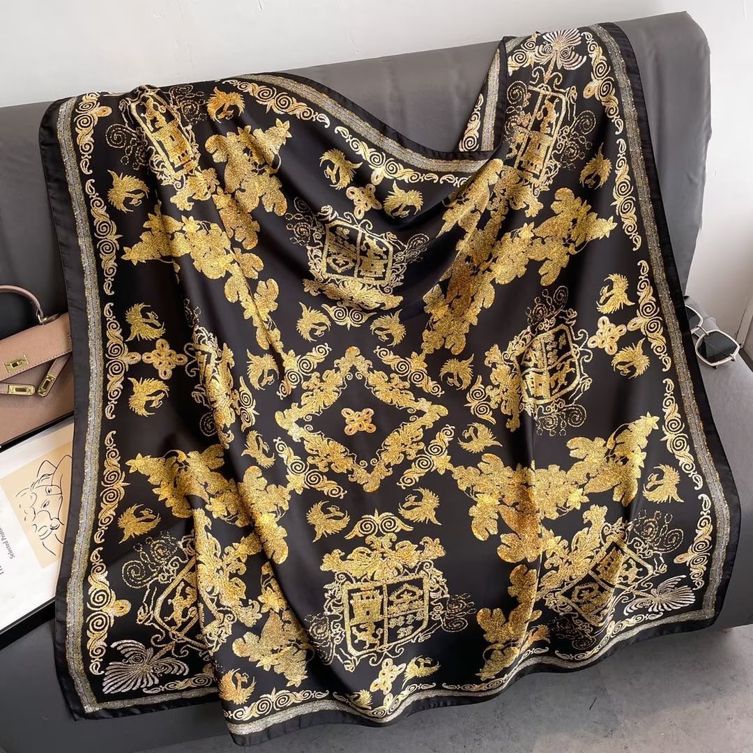 새로운 블랙 골드 프린트 대형 스퀘어 스카프 110cm 리 브로케이드 새틴 스퀘어 스카프 숄 여름 여성 자외선 차단제 스카프스토어 가기