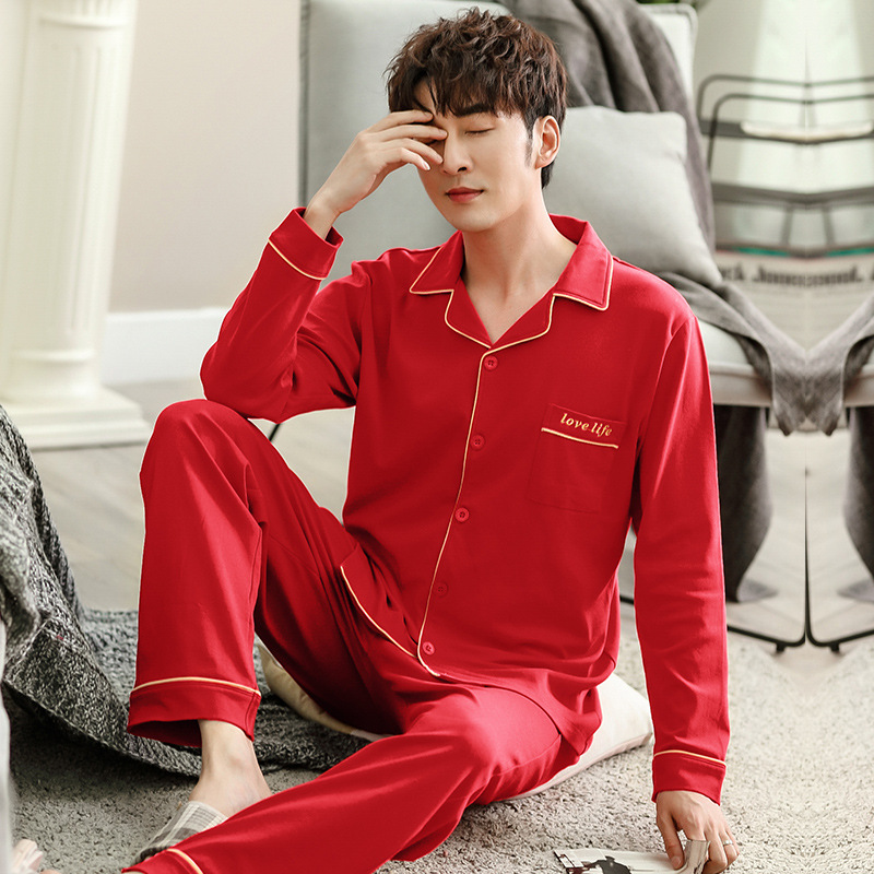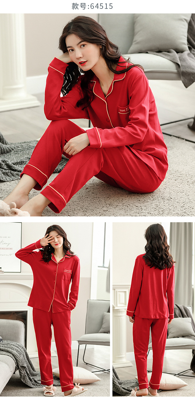 커플 웨딩 잠옷 여자의 봄과 가을 순면 긴팔 홍윤 잠옷 여자의 빨간 신혼 가족 년 남자의 가정복