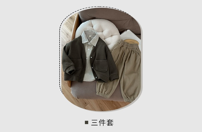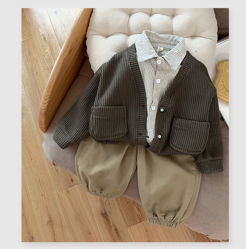 소년 정장 2025 가을 새로운 스타일 니트 재킷 한국 스타일 셔츠와 바지 3 피스 세트 중소 어린이를위한 Dropshipping스토어 가기