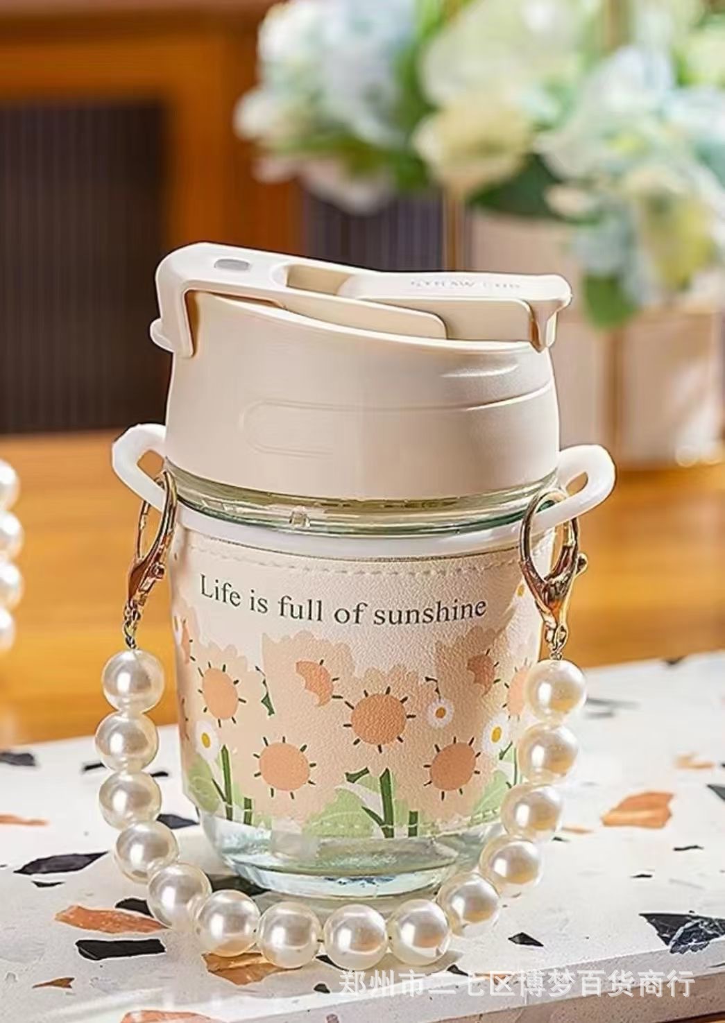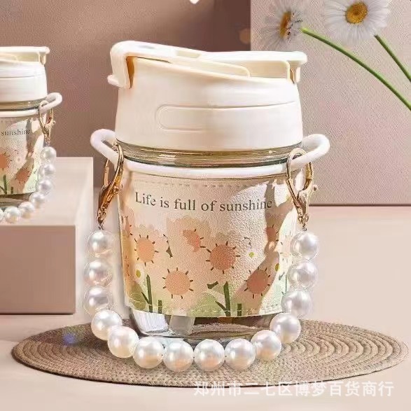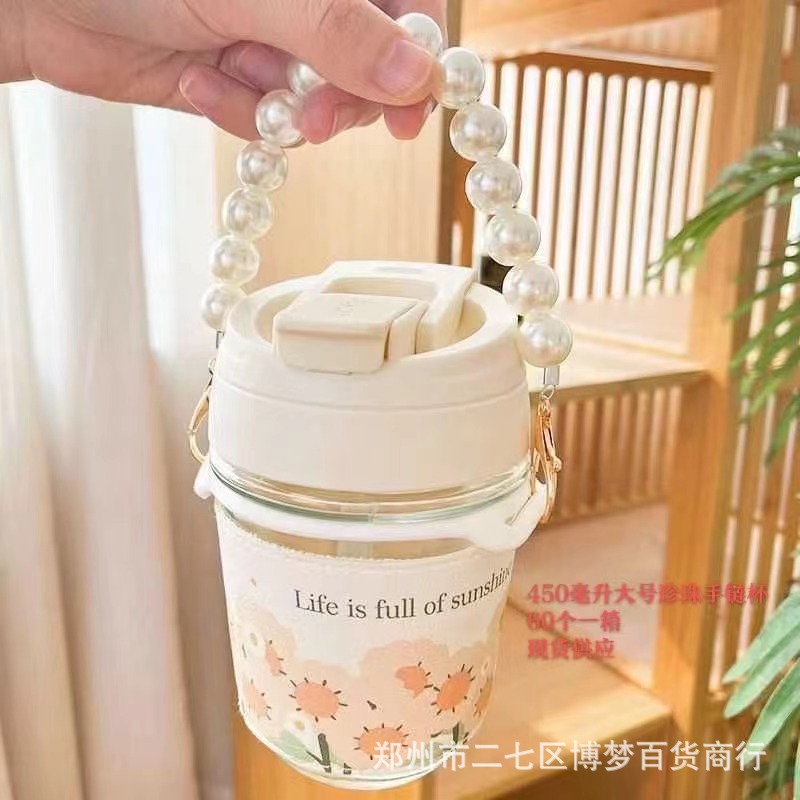 Maxiang 진주 핸드 헬드 컵 귀여운 진주 컵 만화 물 컵 핸드 헬드 체인 유리 이중 음료 컵 높은 아름다움 가치 소녀의 컵스토어 가기