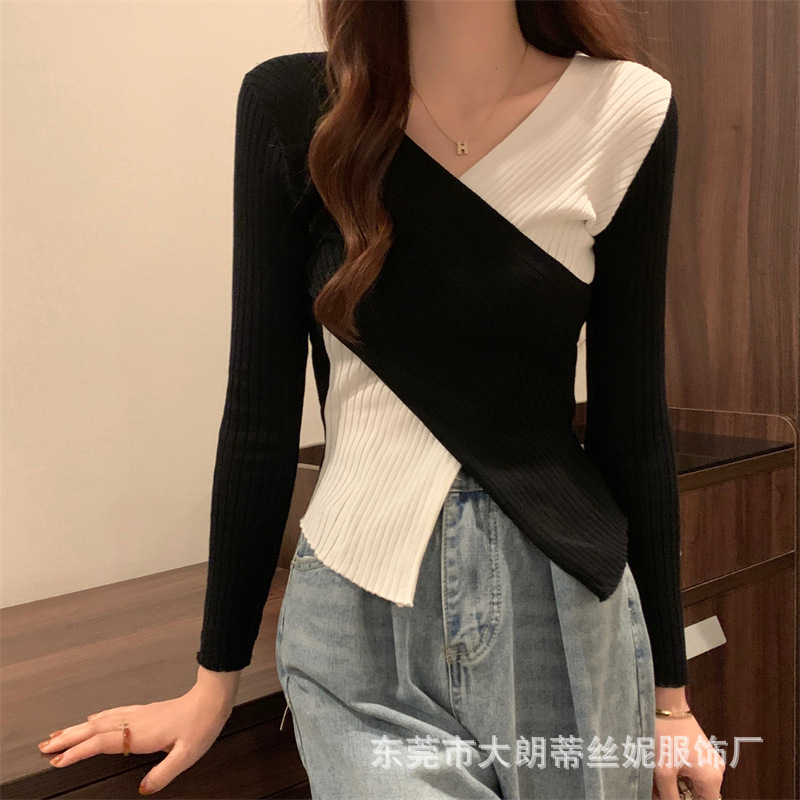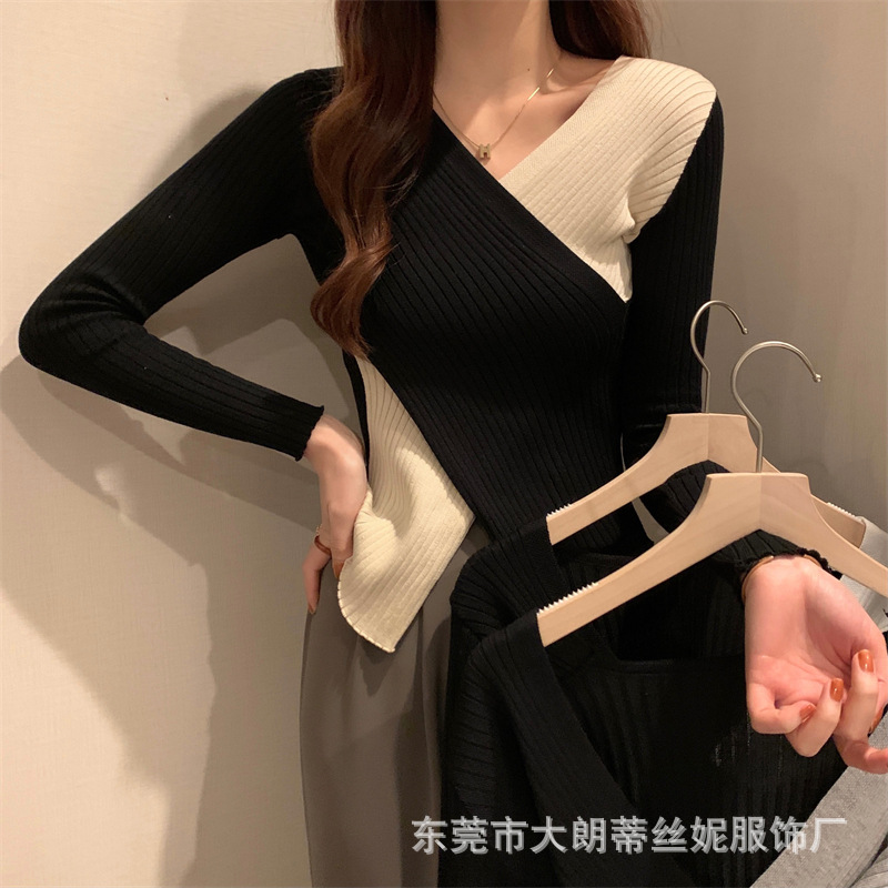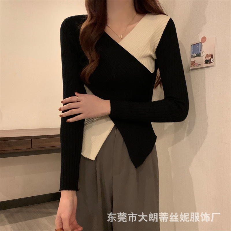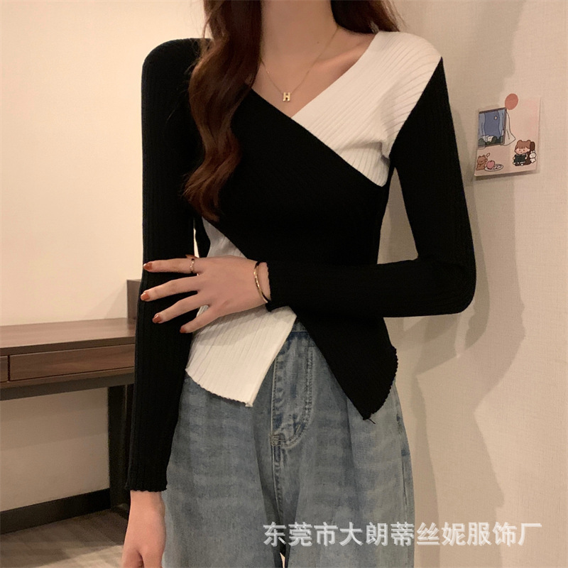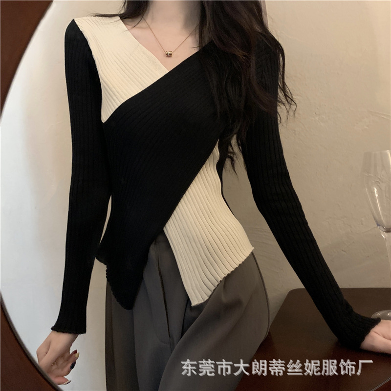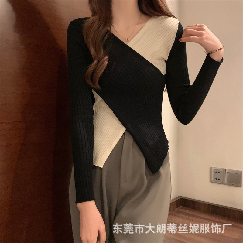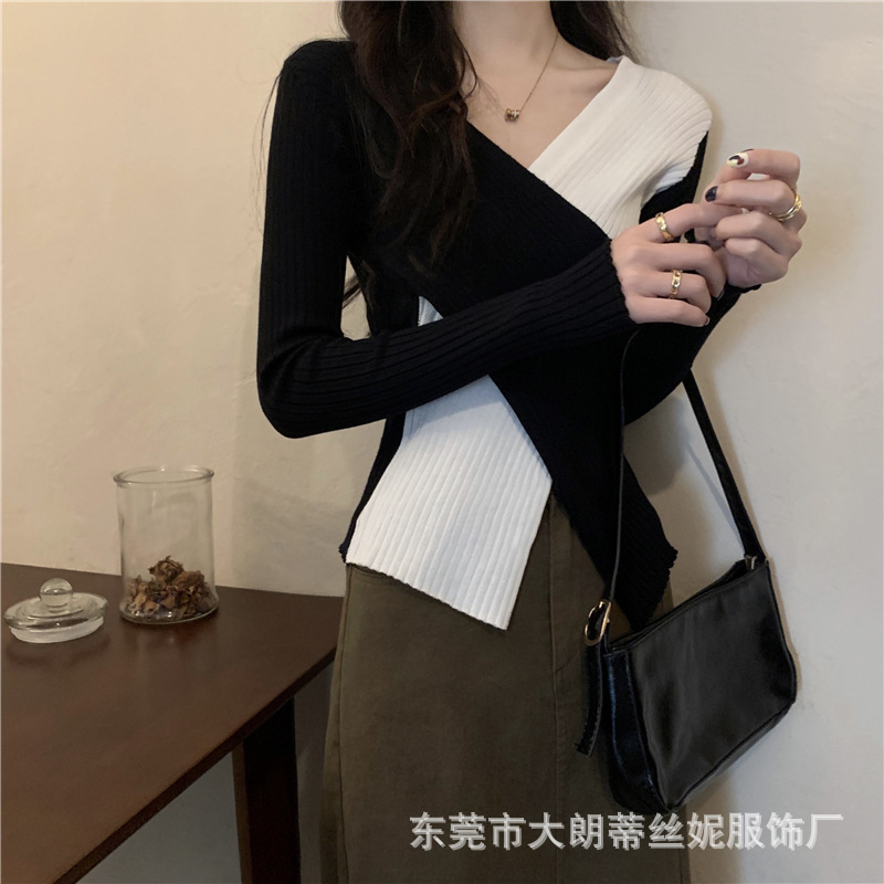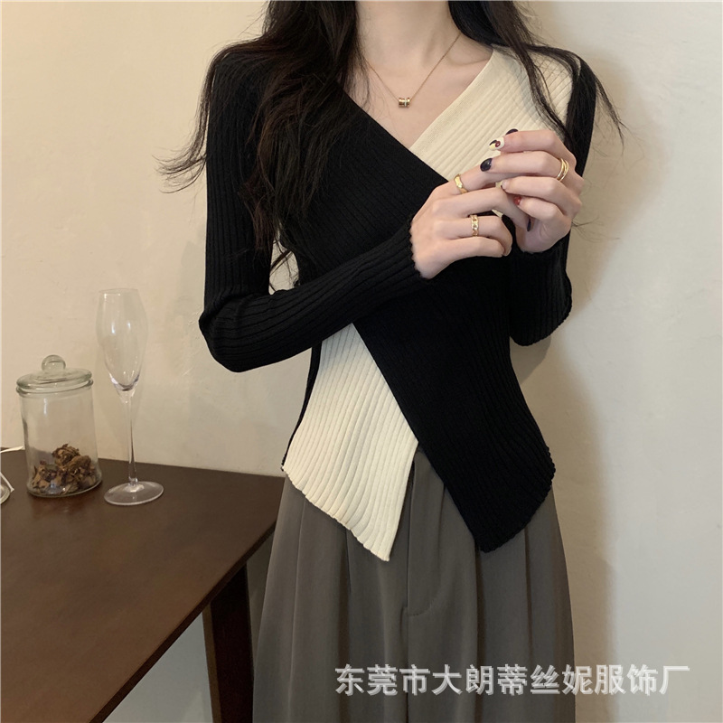 여성용 스웨터 탑 여름 2023 새로운 대비 컬러 크로스 디자인 틈새 슬림 핏 내부베이스 스웨터 트렌디스토어 가기