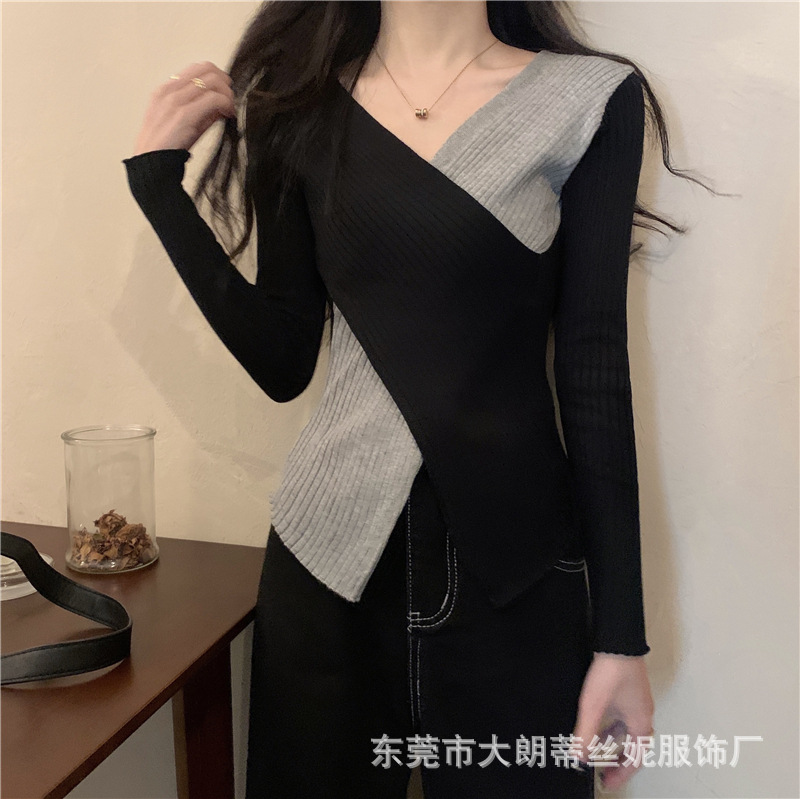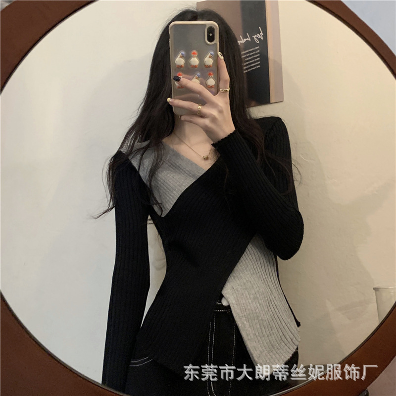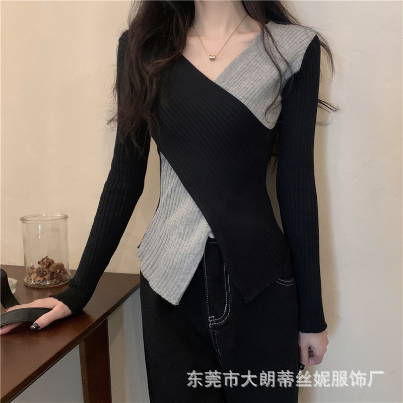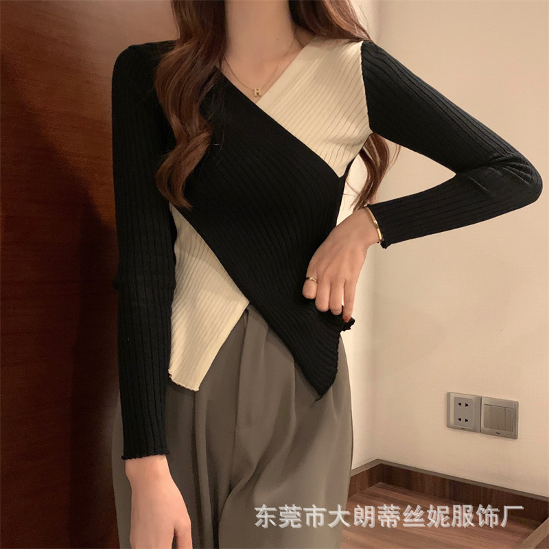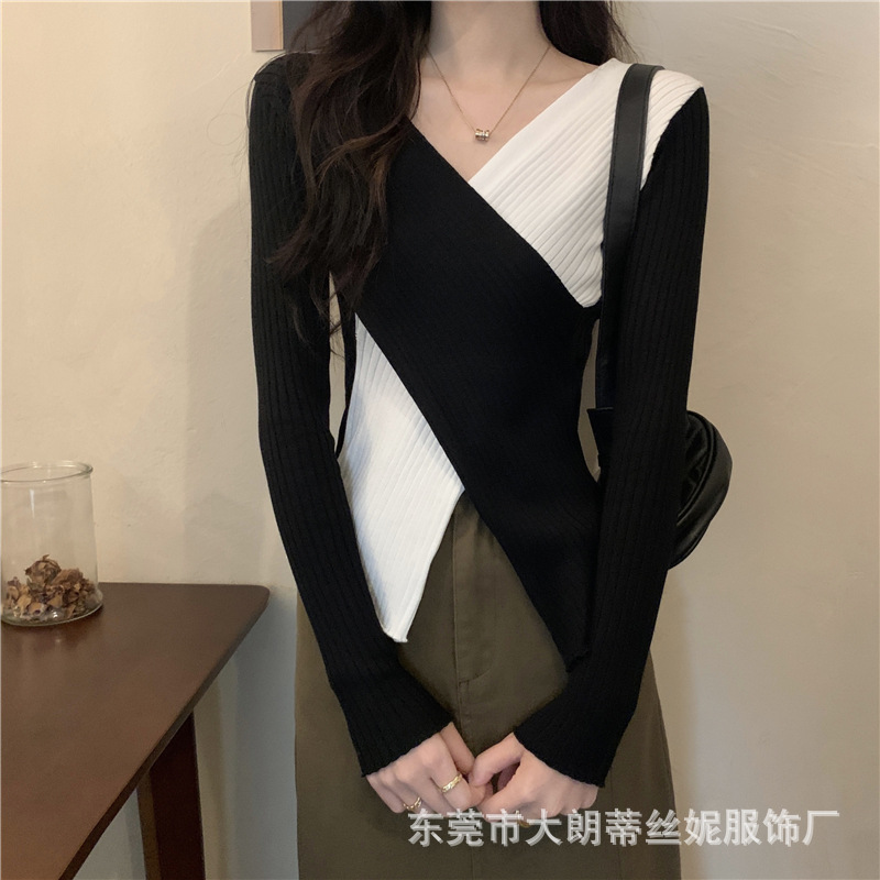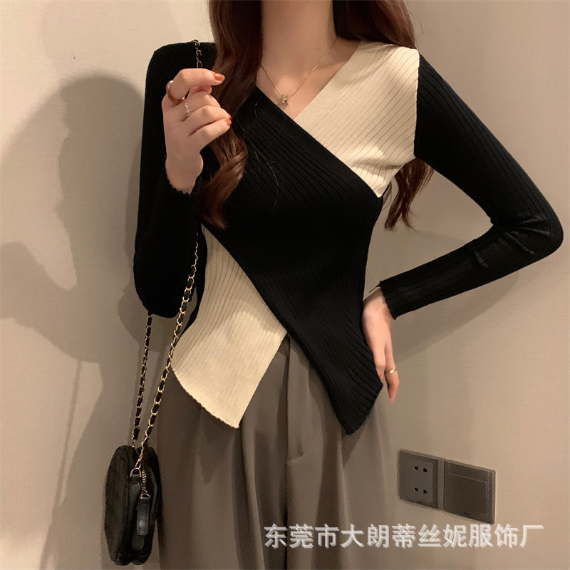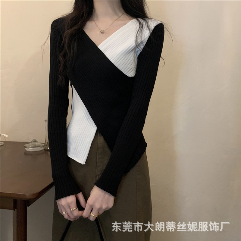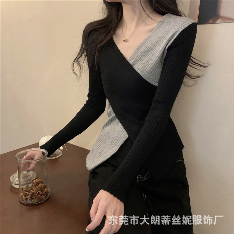 여성용 스웨터 탑 여름 2023 새로운 대비 컬러 크로스 디자인 틈새 슬림 핏 내부베이스 스웨터 트렌디스토어 가기