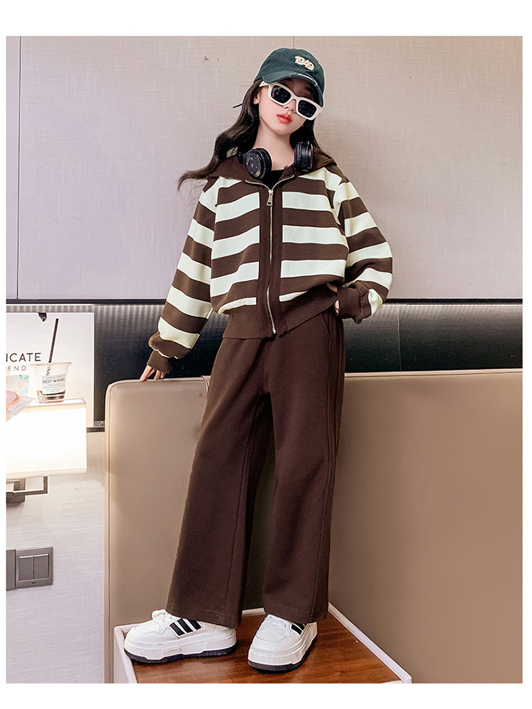 여아 세트 봄 가을 2023 신상 아동 스트라이프 후드 가디건 탑 아동 와이드 레그 팬츠 투피스 세트