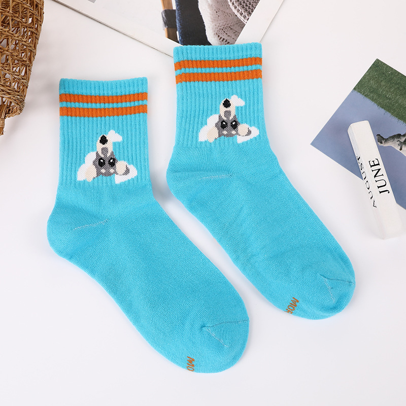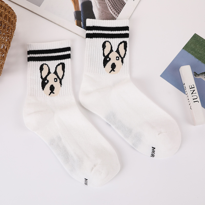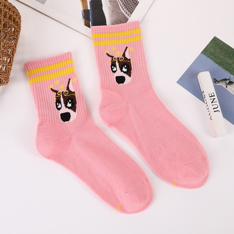 봄과 가을 귀여운 강아지 패턴 튜브 양말 학생 스트라이프 2 바 폴리 에스테르 양말 트렌드 네트 레드 롱 양말 도매스토어 가기