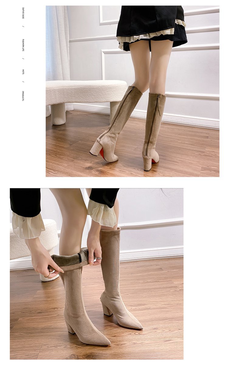 2023 가을과 겨울 새로운 스웨이드 뾰족한 두꺼운 뒤꿈치 뒤 지퍼 패션 하이 부츠 여성용 하이힐 천 얇은 다리 부츠