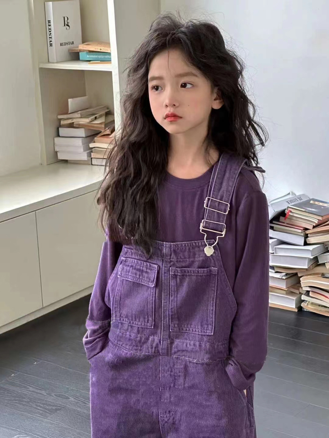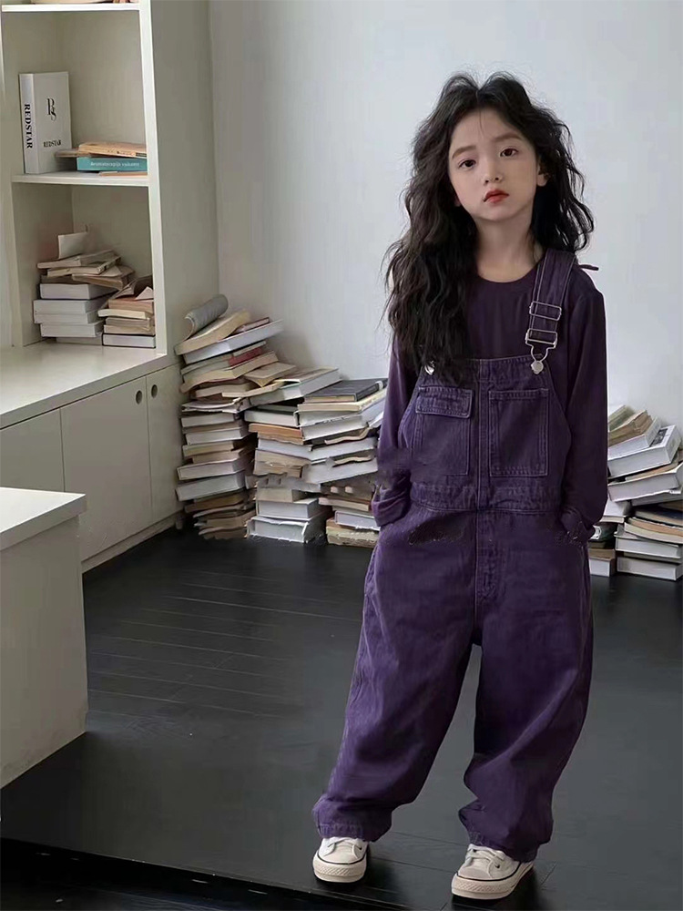 여아용 보라색 멜빵바지 세트 2025 봄 가을 아동 패션 긴팔 셔츠 데님 와이드 팬츠 투피스 세트스토어 가기