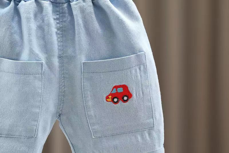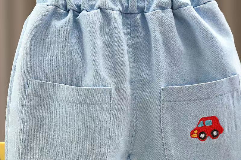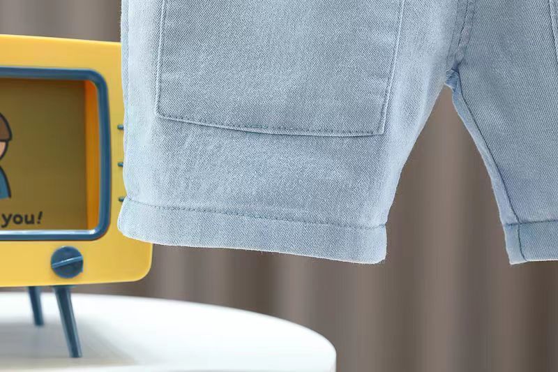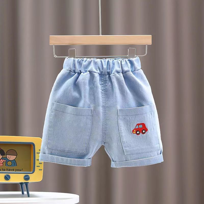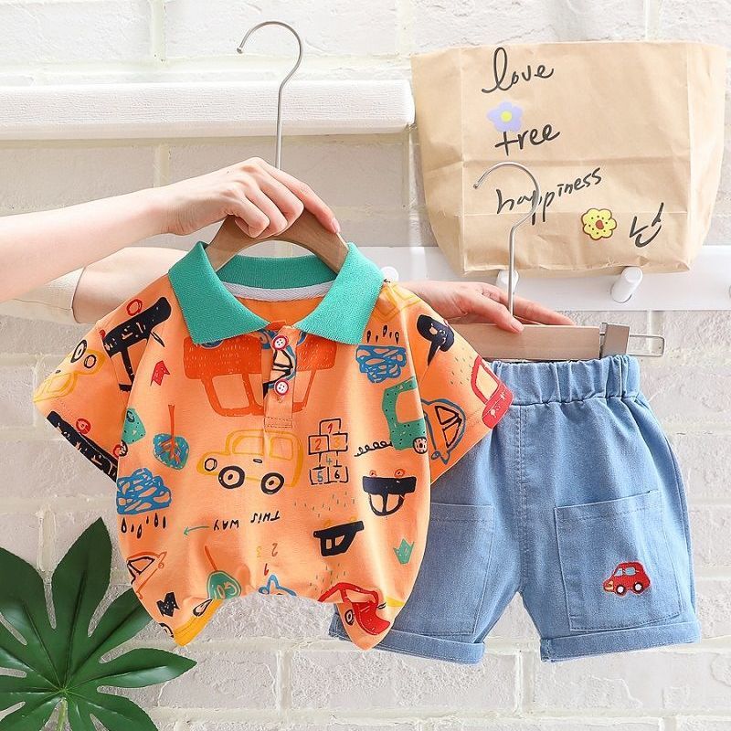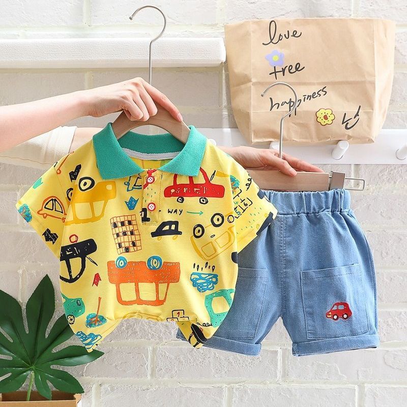 여름 새 남자와 여자의 보물 만화 자동차 반팔 세트 귀엽고 편안한 남자와 여자의 어린이 티셔츠 + 반바지 투피스 세트
