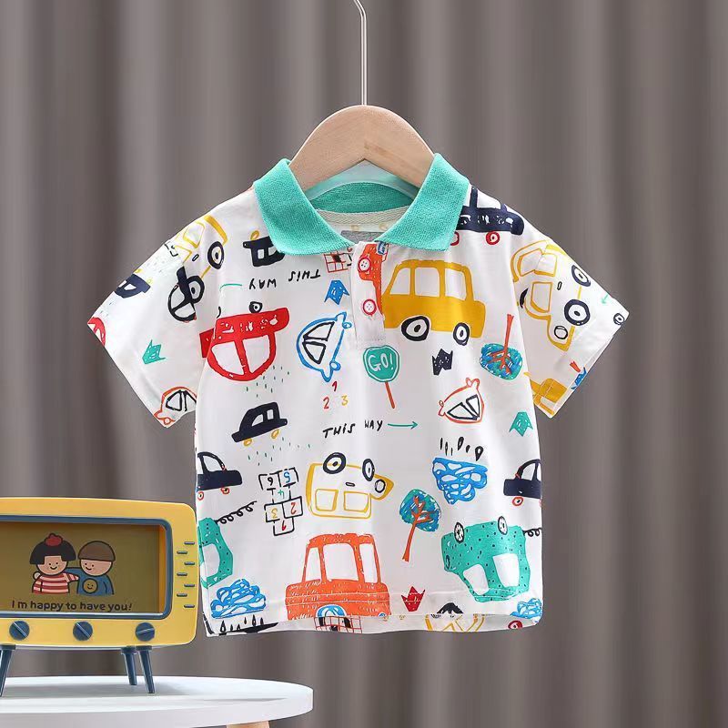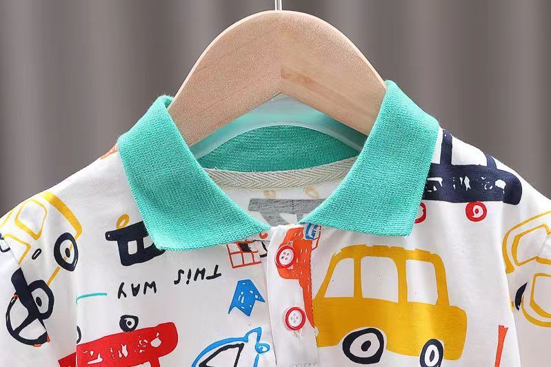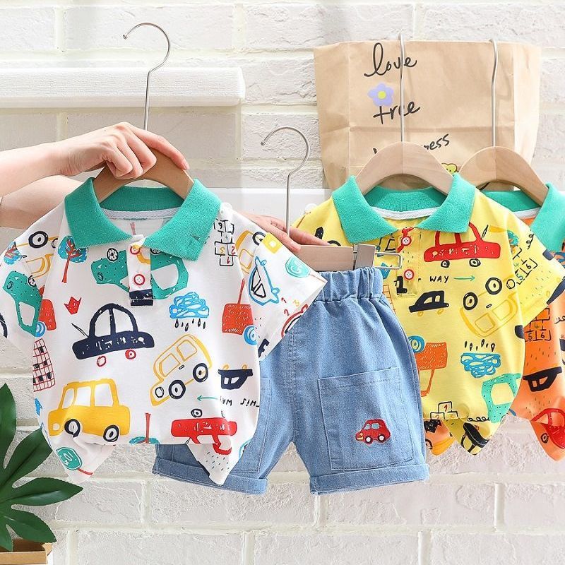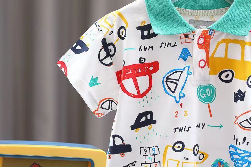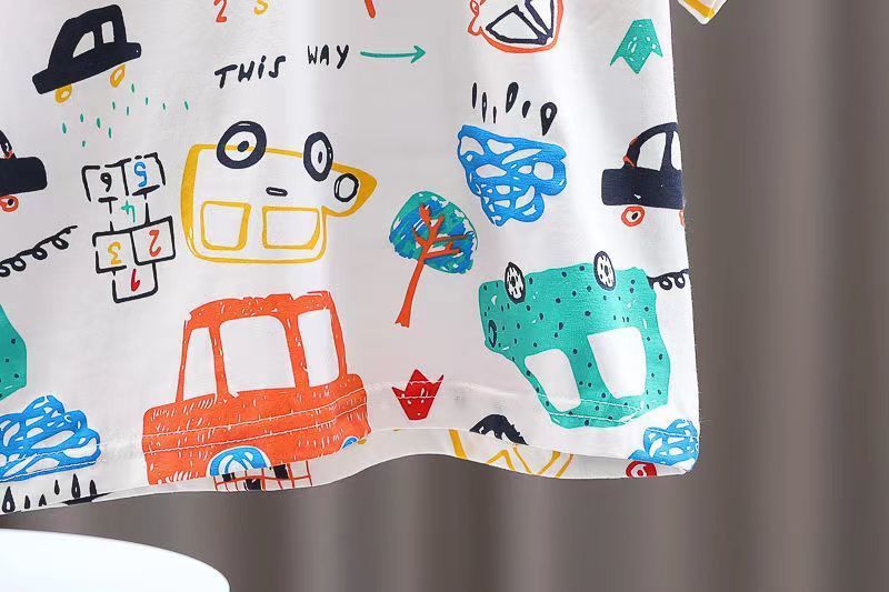 여름 새 남자와 여자의 보물 만화 자동차 반팔 세트 귀엽고 편안한 남자와 여자의 어린이 티셔츠 + 반바지 투피스 세트스토어 가기