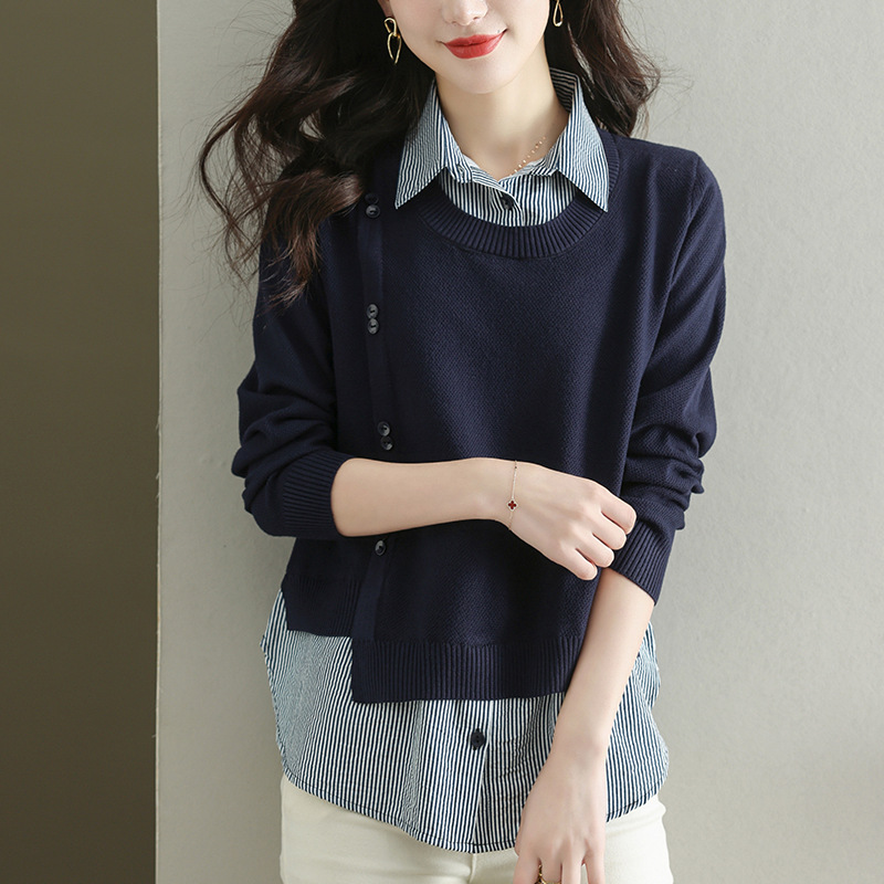 여성용 가짜 투피스 니트 탑, 셔츠 칼라 스웨터, 2025 가을 신상 스타일 여성용 셔츠, 봄, 가을 바닥 셔츠스토어 가기
