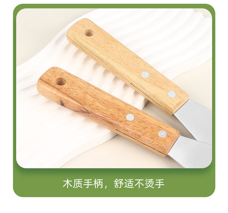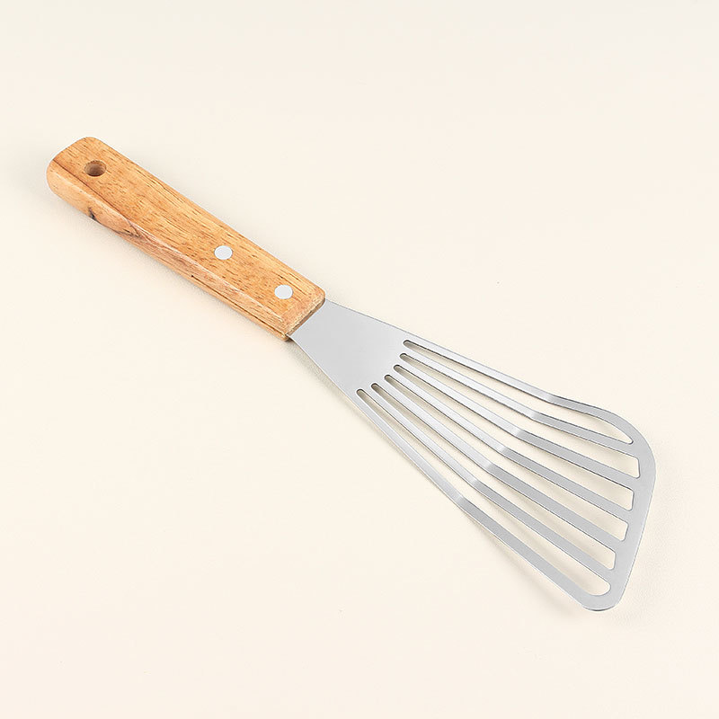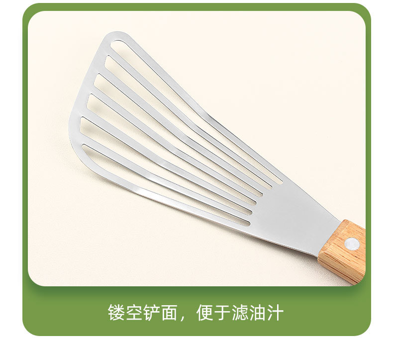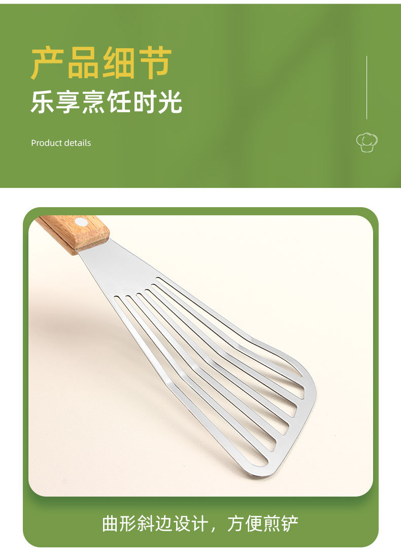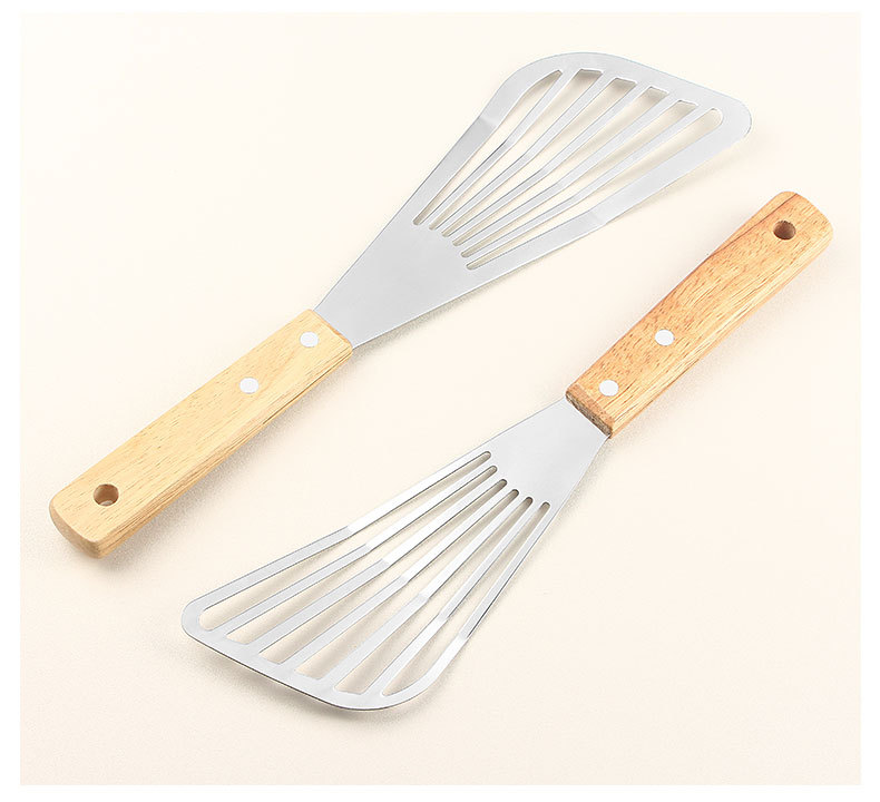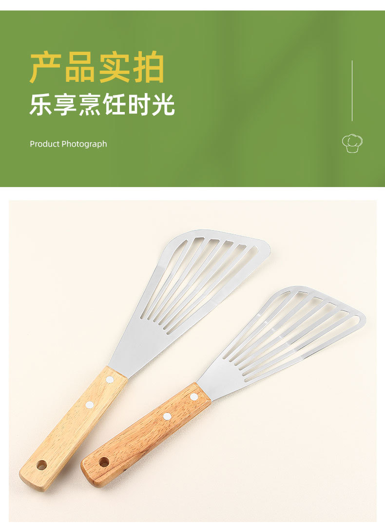 스테인레스 스틸 경사 누출 삽 나무 손잡이 팬 모양 삽 가정용 고온 저항 튀김 삽 비 스틱 팬 튀김 생선 삽 공장 재고