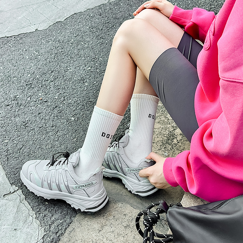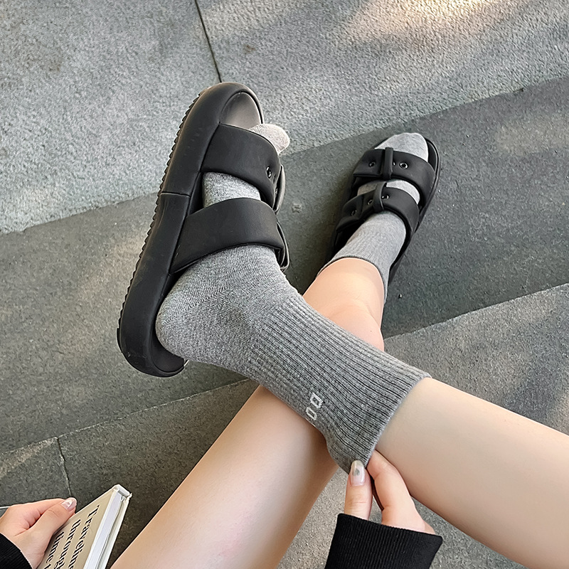 여성용 중목 양말, 가을 겨울용 일본 스타일, 한국 스타일 레터링 롱 양말, 스포츠 스타일 회색 색상, 샤크 팬츠와 함께 착용하는 면 양말