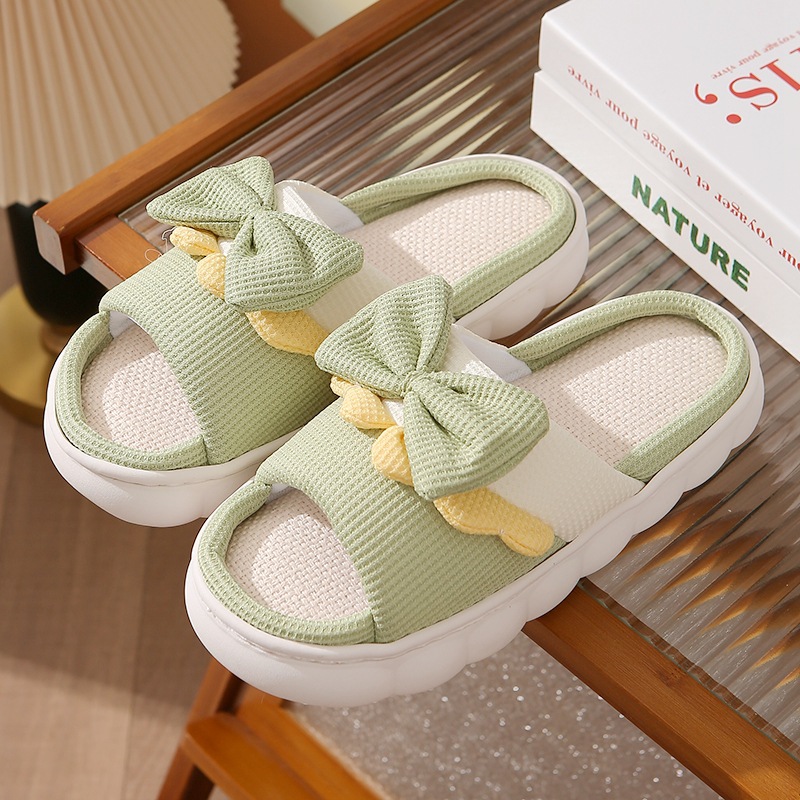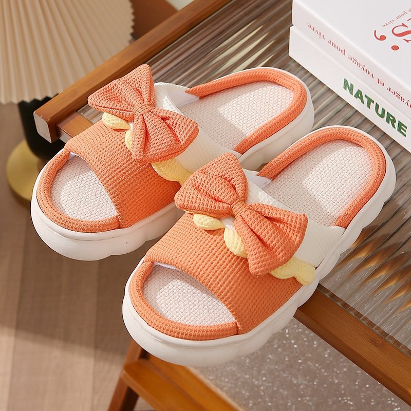 新款蝴蝶结亚麻拖鞋女防滑室内居家居可爱情侣棉麻厚底凉拖夏批发