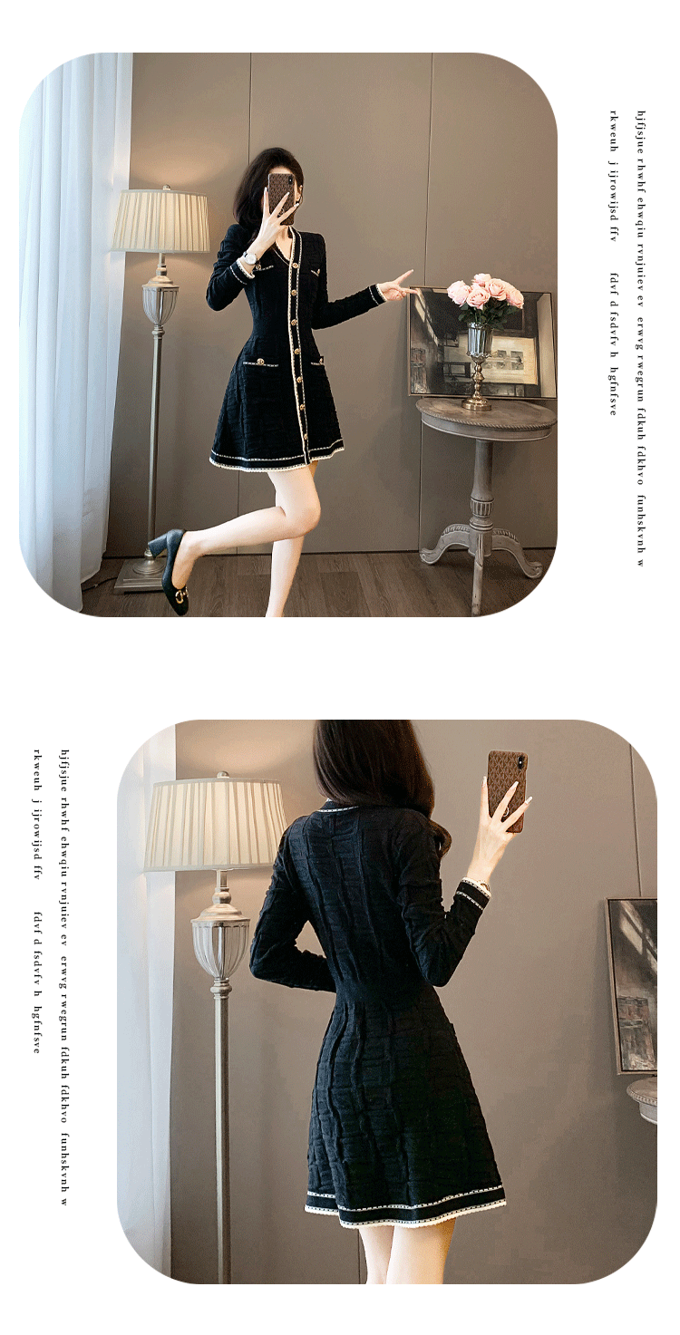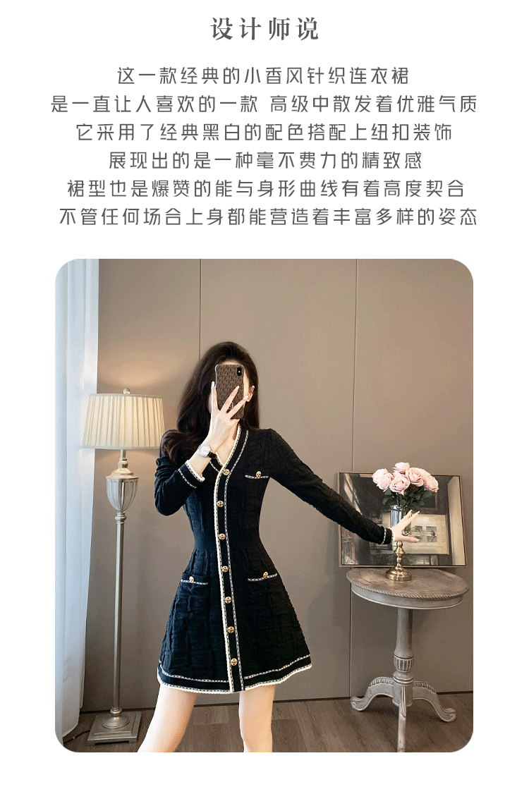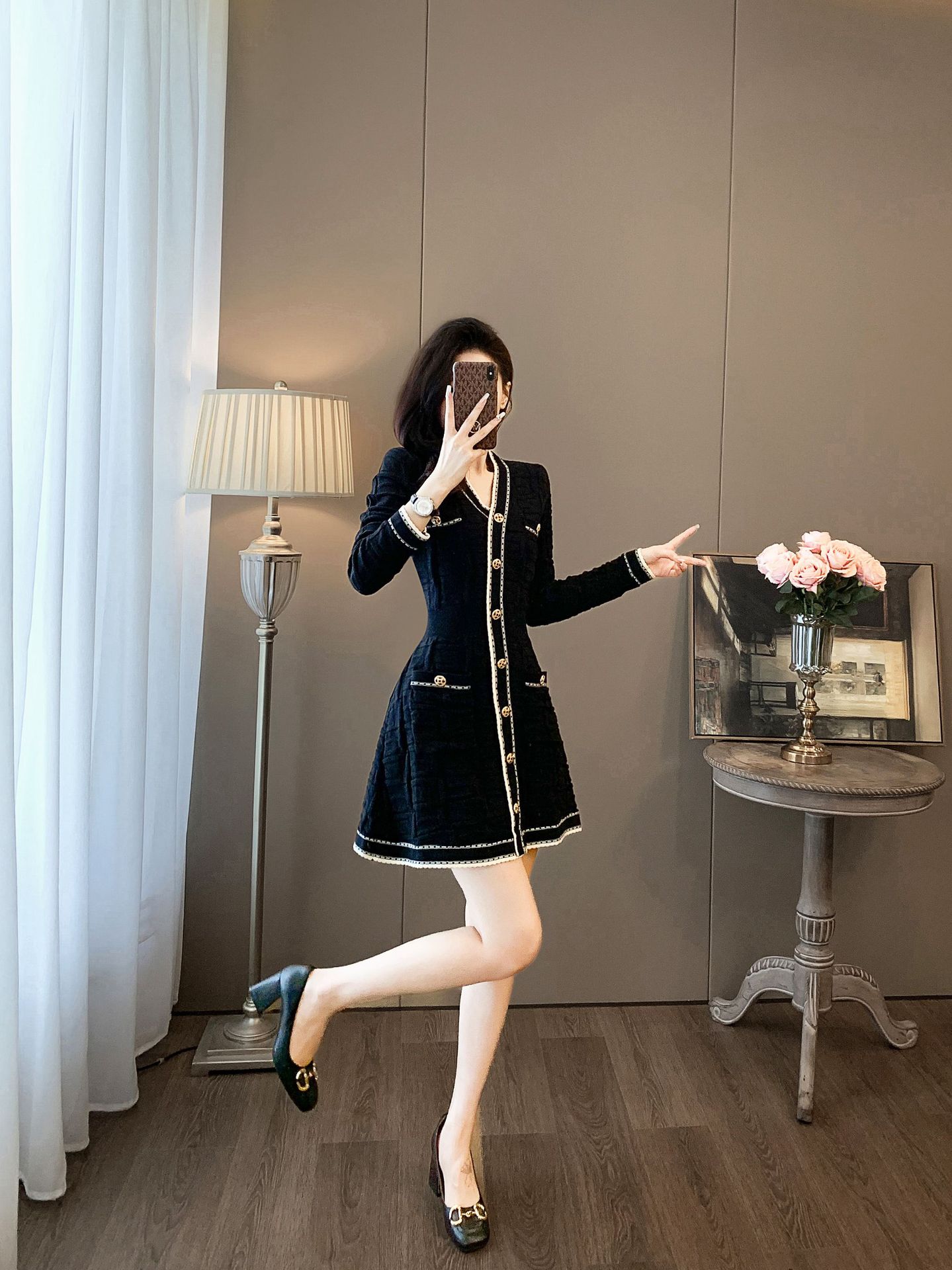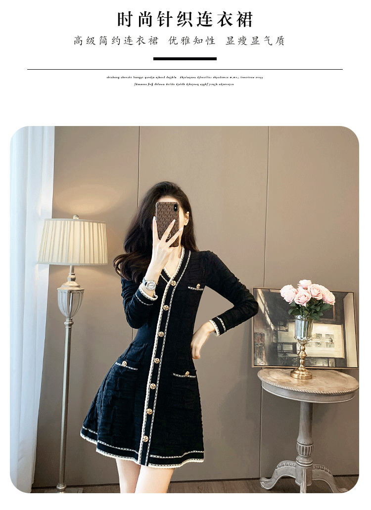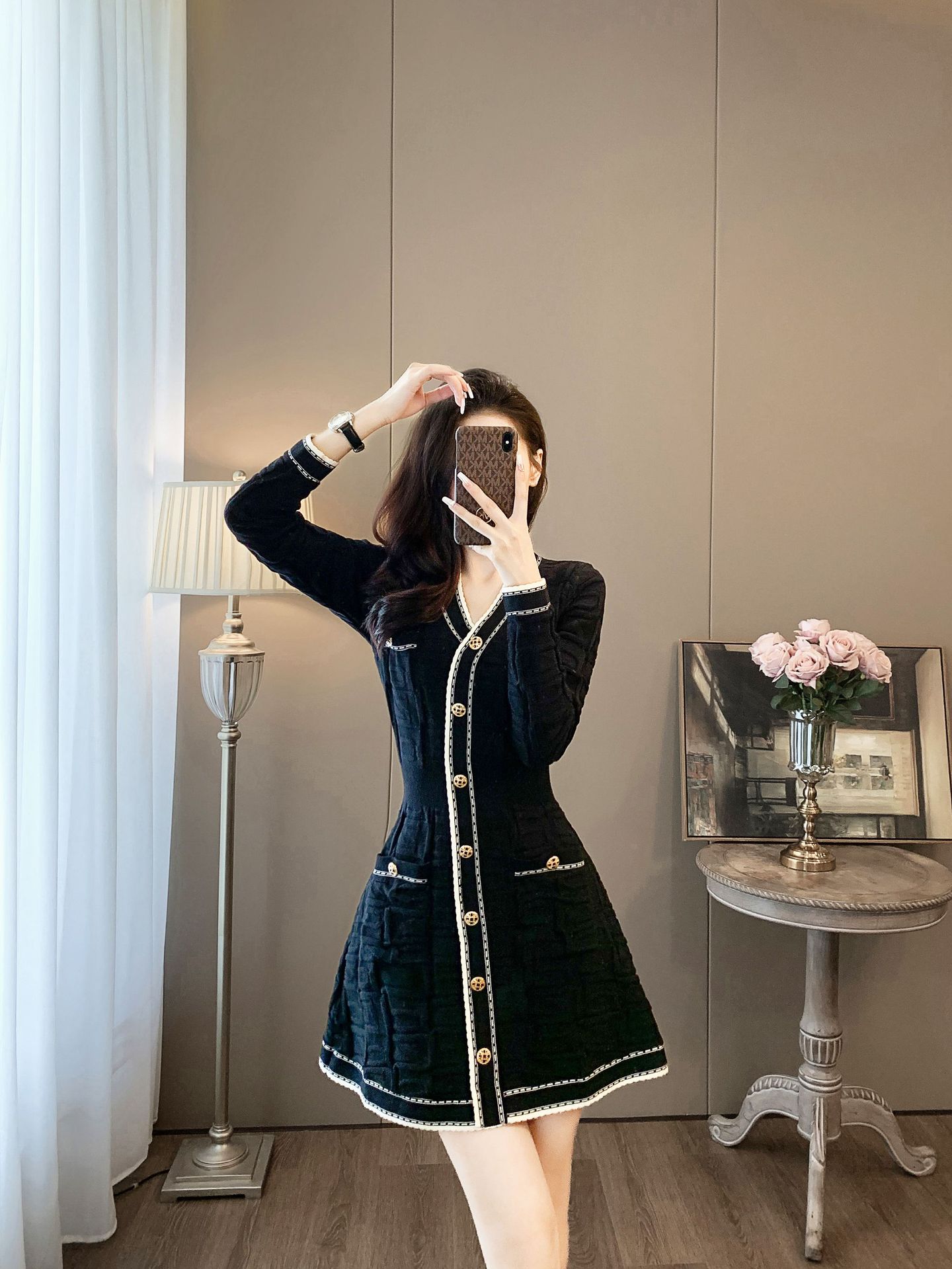2025 신상 작은 향기 스타일 원피스, 패셔너블한 프렌치 스타일, 슬림한 브이넥, 작은 키 여성을 위한 긴 소매 니트 원피스스토어 가기