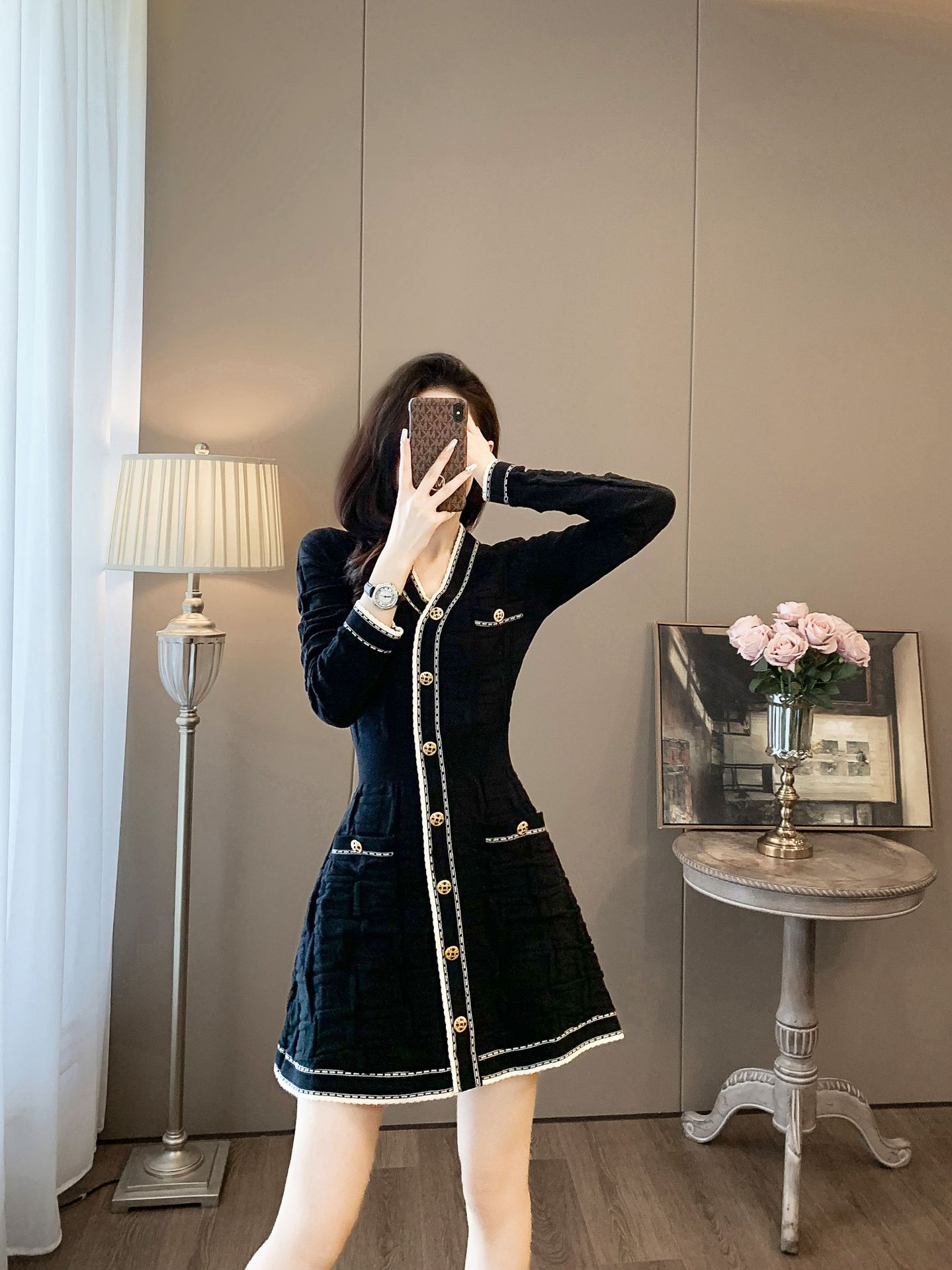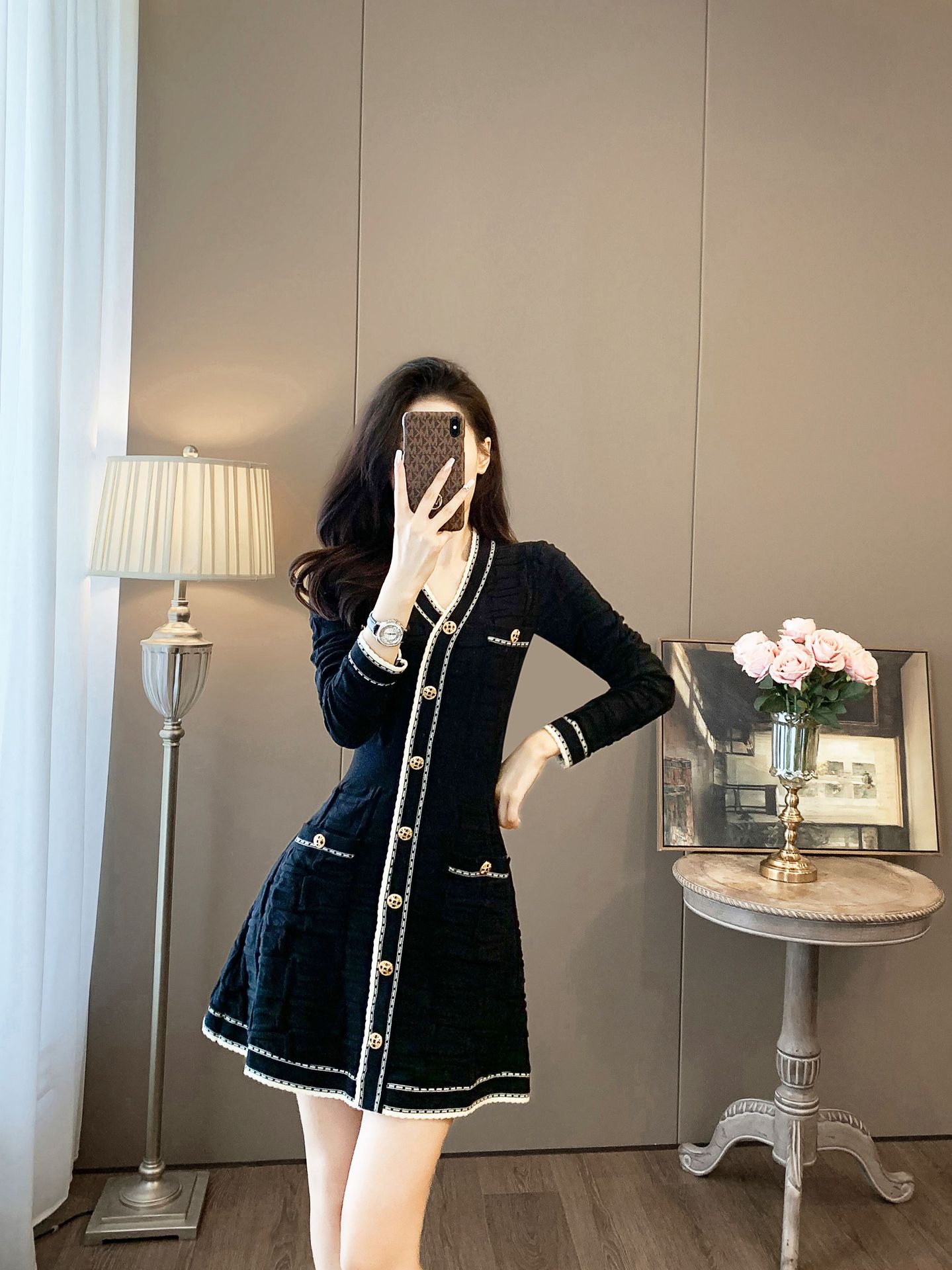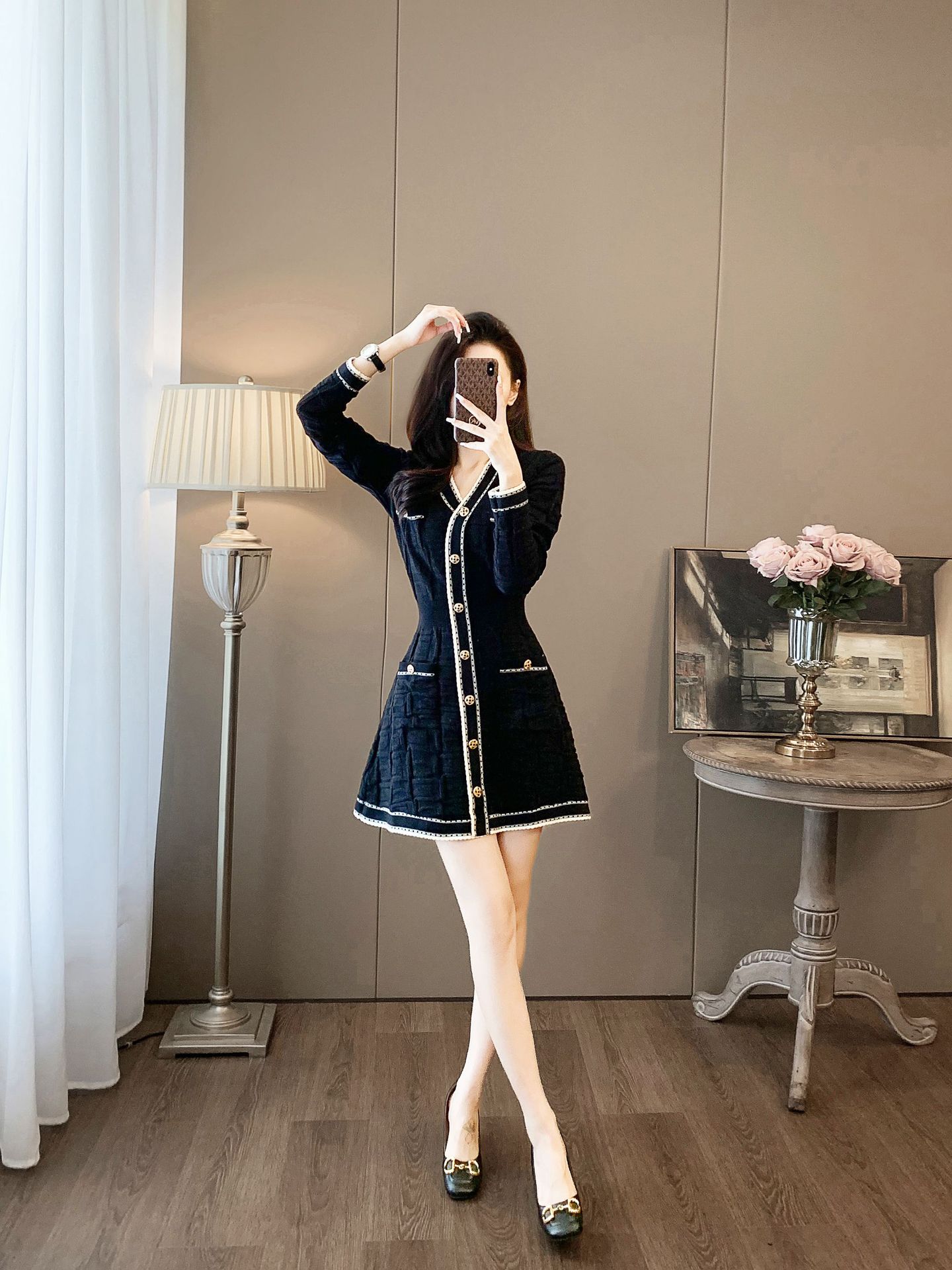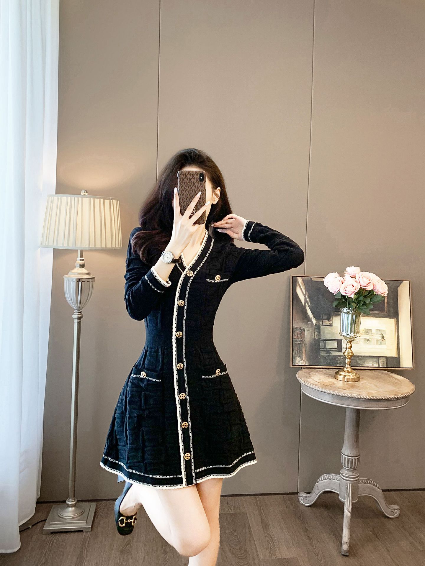 2025 신상 작은 향기 스타일 원피스, 패셔너블한 프렌치 스타일, 슬림한 브이넥, 작은 키 여성을 위한 긴 소매 니트 원피스스토어 가기