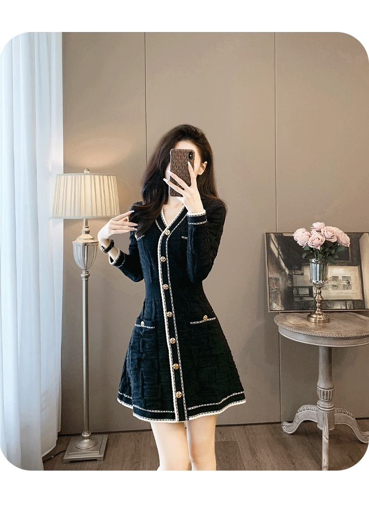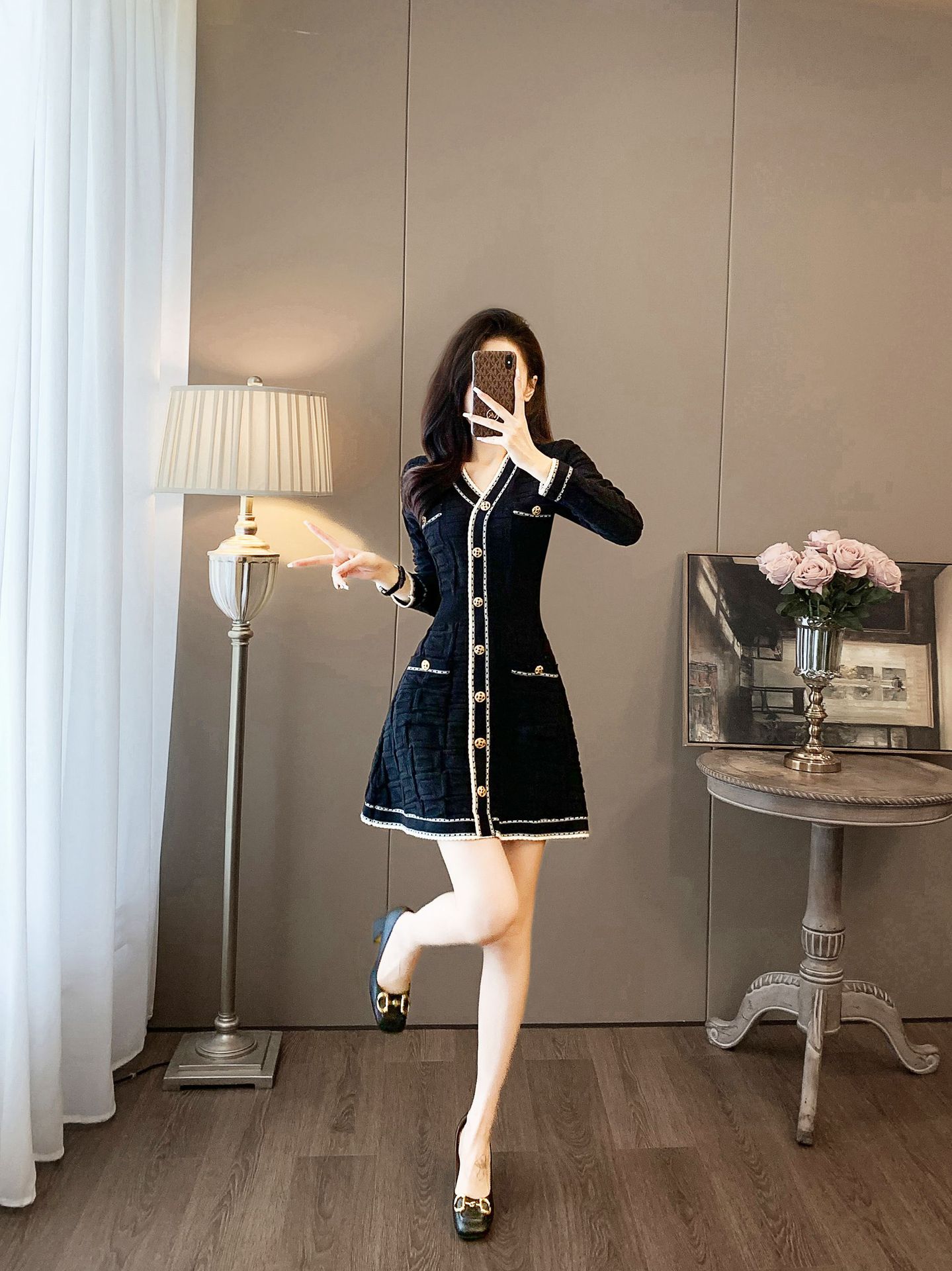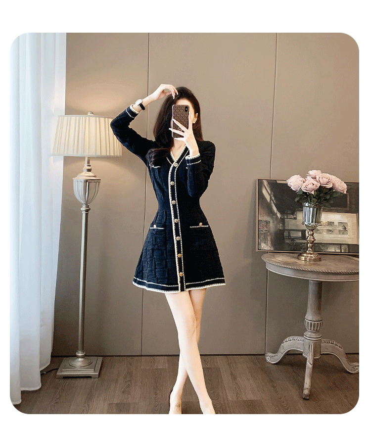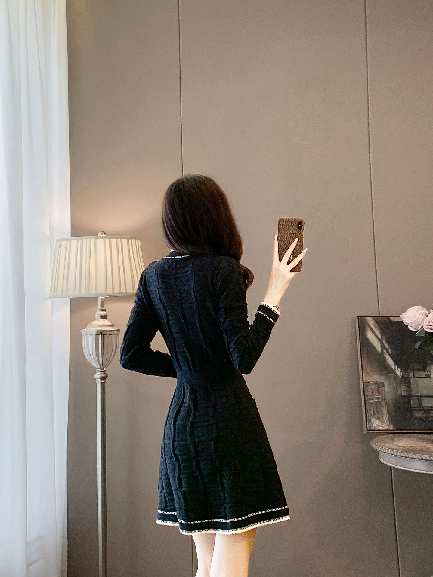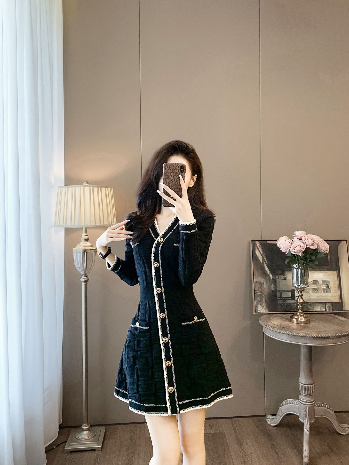 2025 신상 작은 향기 스타일 원피스, 패셔너블한 프렌치 스타일, 슬림한 브이넥, 작은 키 여성을 위한 긴 소매 니트 원피스스토어 가기