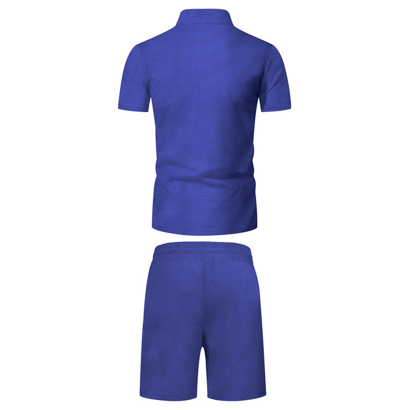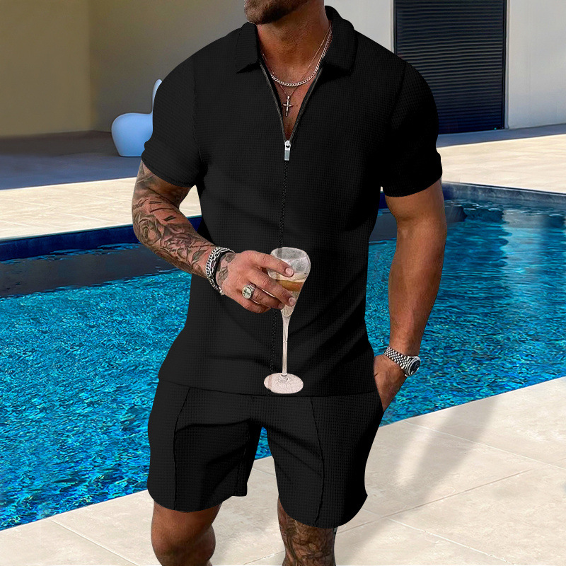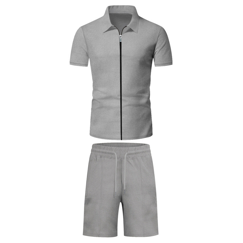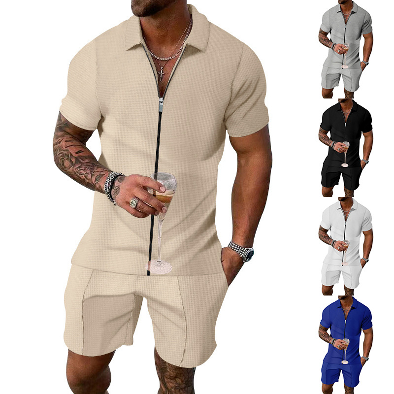 2023 크로스 보더 유럽과 미국 여름 남자의 새로운 독립 역 공급 캐주얼 대비 지퍼 라펠 카디건 반팔 세트