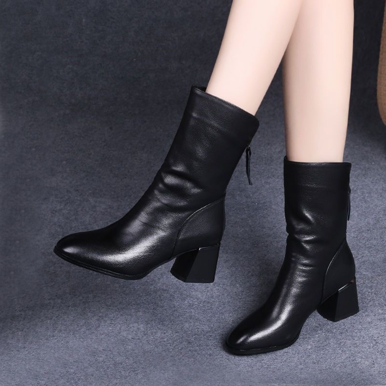 2023 새로운 가을과 겨울 하이힐 부츠 여성용 미들 부츠 두꺼운 굽 뾰족한 발목 부츠 미들 힐 부드러운 가죽 신발 마틴 부츠스토어 가기