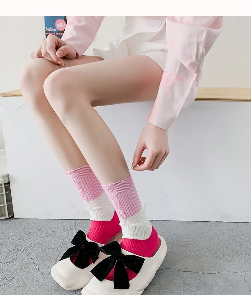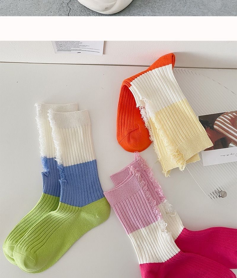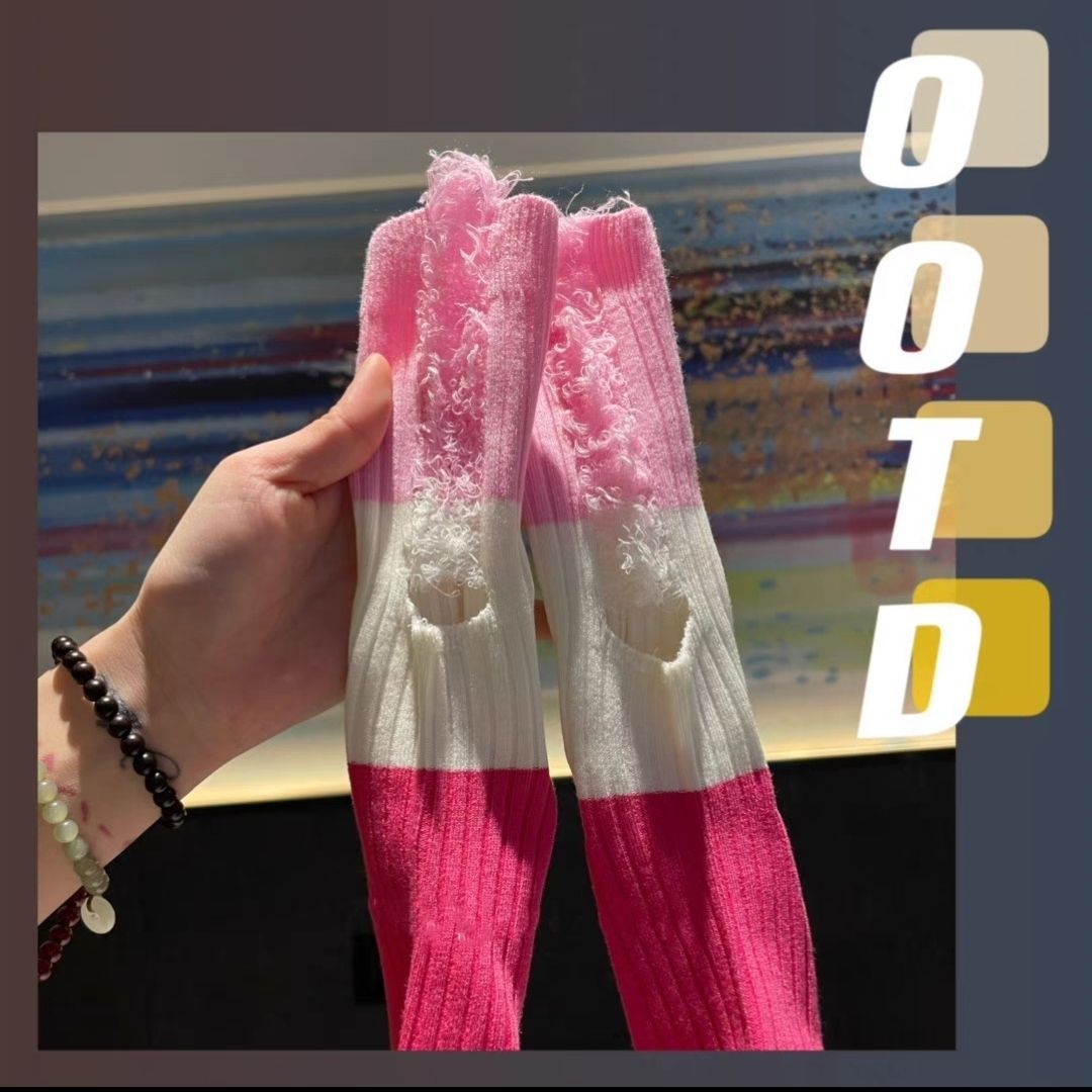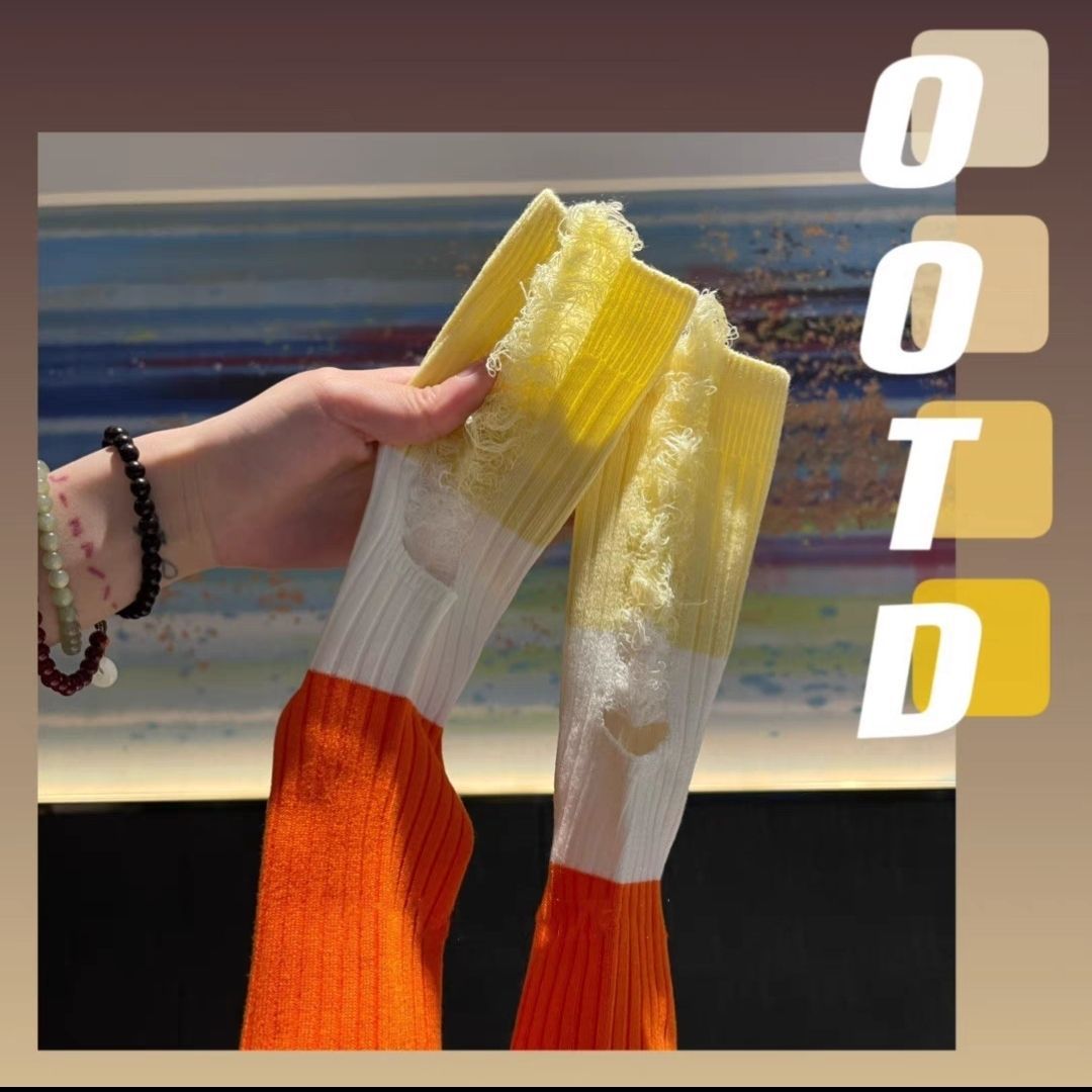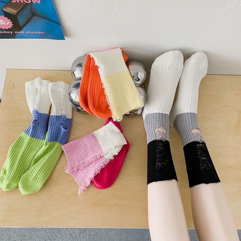 찢어진 거지 컬러 매칭 양말 여성용 여름 얇은 대비 컬러 스티치 트렌디 한 인터넷 축하 개인 겉옷 미드 튜브 스택 양말스토어 가기
