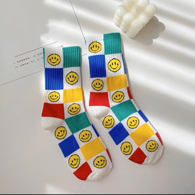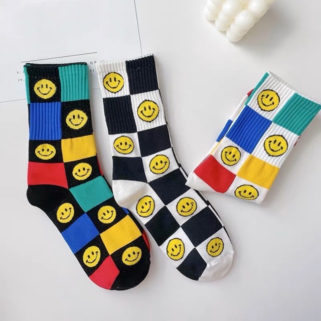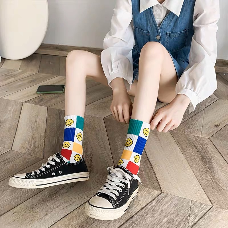 양말 여성용 봄과 여름 미드 튜브 인 트렌디 한 컬러 격자 스마일 양말 가을과 겨울 한국식 독특한 대비 색상 바둑판 미드 튜브 양말스토어 가기