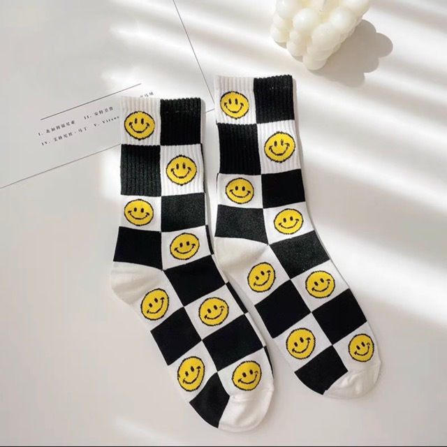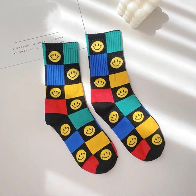 양말 여성용 봄과 여름 미드 튜브 인 트렌디 한 컬러 격자 스마일 양말 가을과 겨울 한국식 독특한 대비 색상 바둑판 미드 튜브 양말