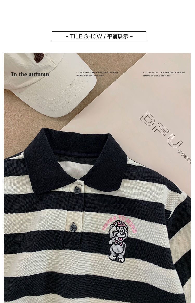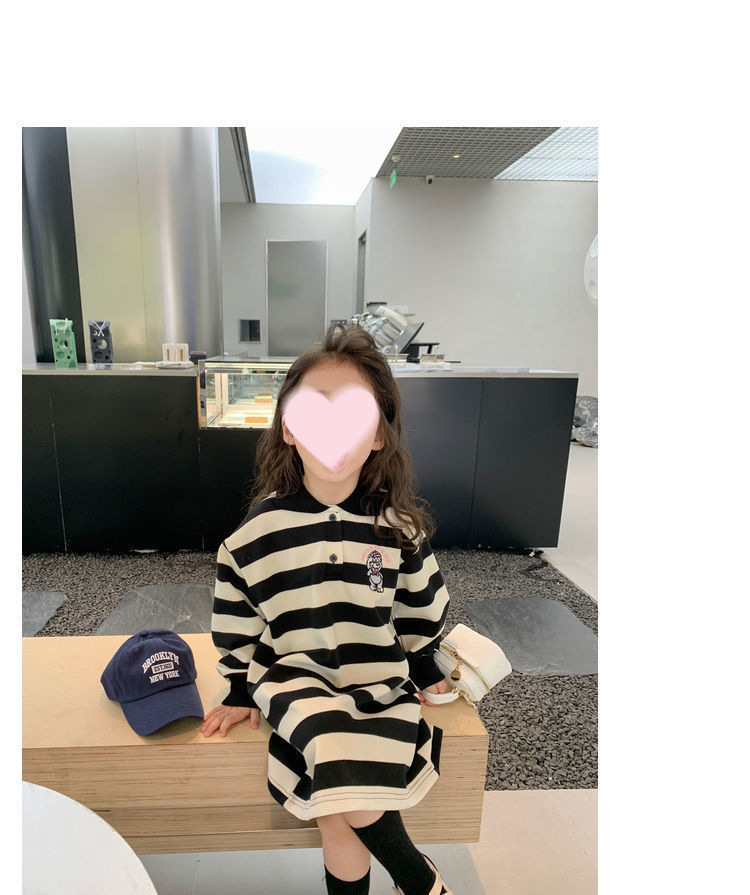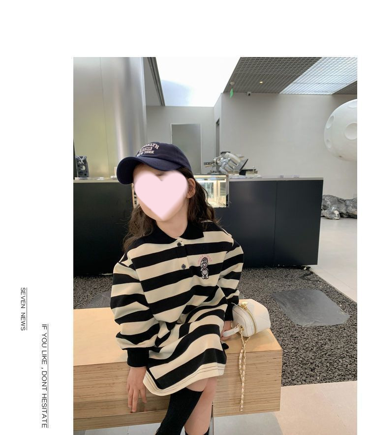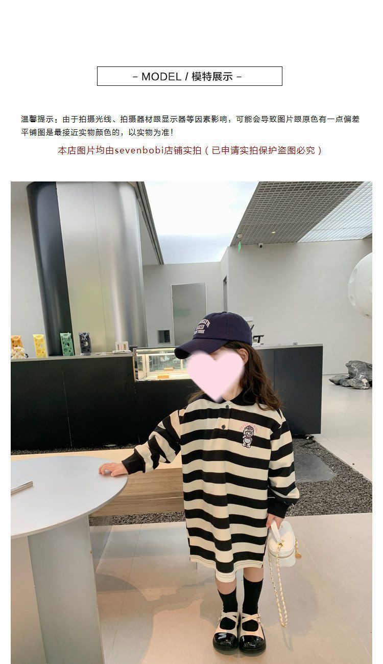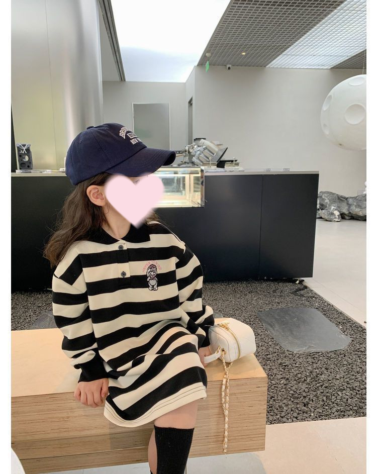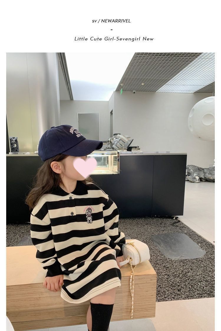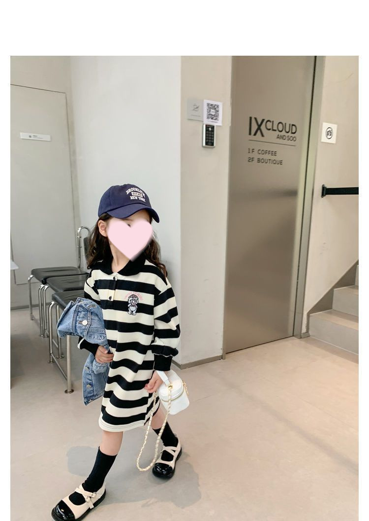 여아용 한국 스타일 원피스 2024년 신상 봄 가을 어린이용 세련된 캐주얼 스트라이프 폴로 칼라 스웨트셔츠 원피스스토어 가기