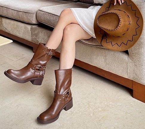 정품 가죽 웨스턴 데님 부츠 복고풍 여름 얇은 기사 스퀘어 발가락 여성의 긴 배럴 하이힐 오토바이 사막 마틴 부츠스토어 가기